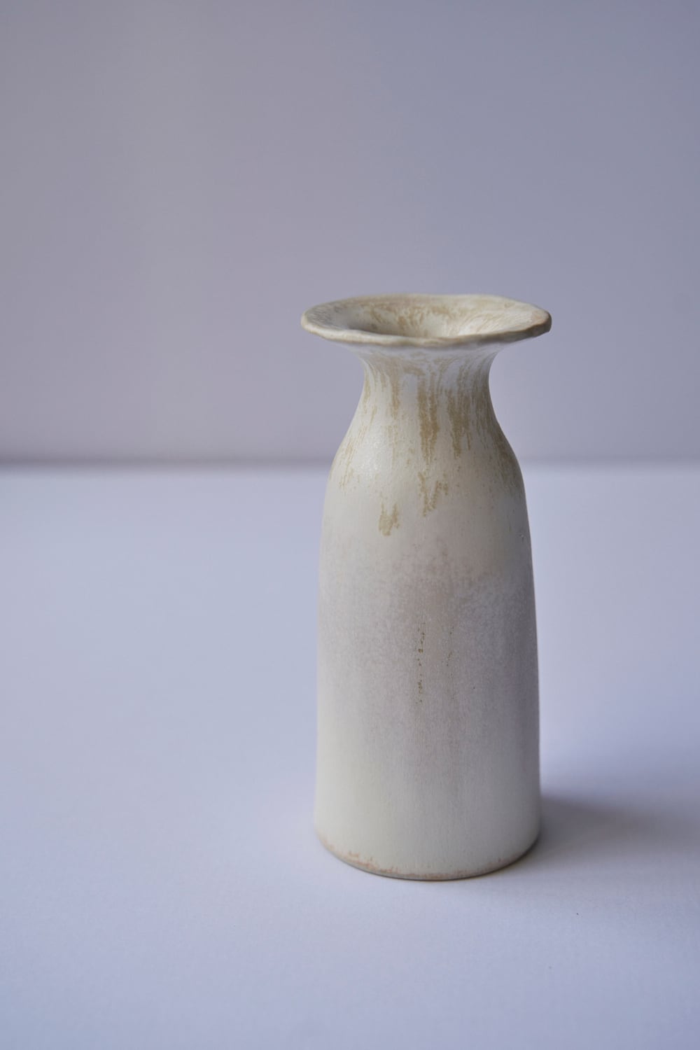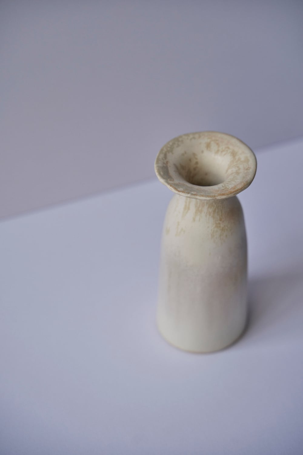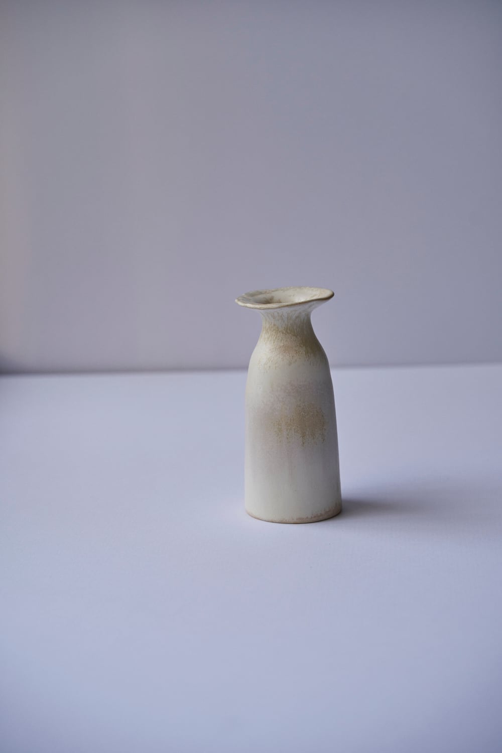 釉薬、形どちらもとても柔らかい表現をされる五嶋穂波さんの作品。花器はフォルムも去ることながら、使いやすさもよく考えられています。流れるような釉薬の景色が見どころです。 素材 : 陶土 サイズ : 約 口径2.5cm × H 15.5cm 発送が年内は12月29日までです(土日除外)。その後は1月11日以降の発送となります。ご注意ください。また、サイズは若干の誤差が生じます。モニターの環境により実際の色と異なる見え方になる場合があります。ご理解の上ご購入ください。