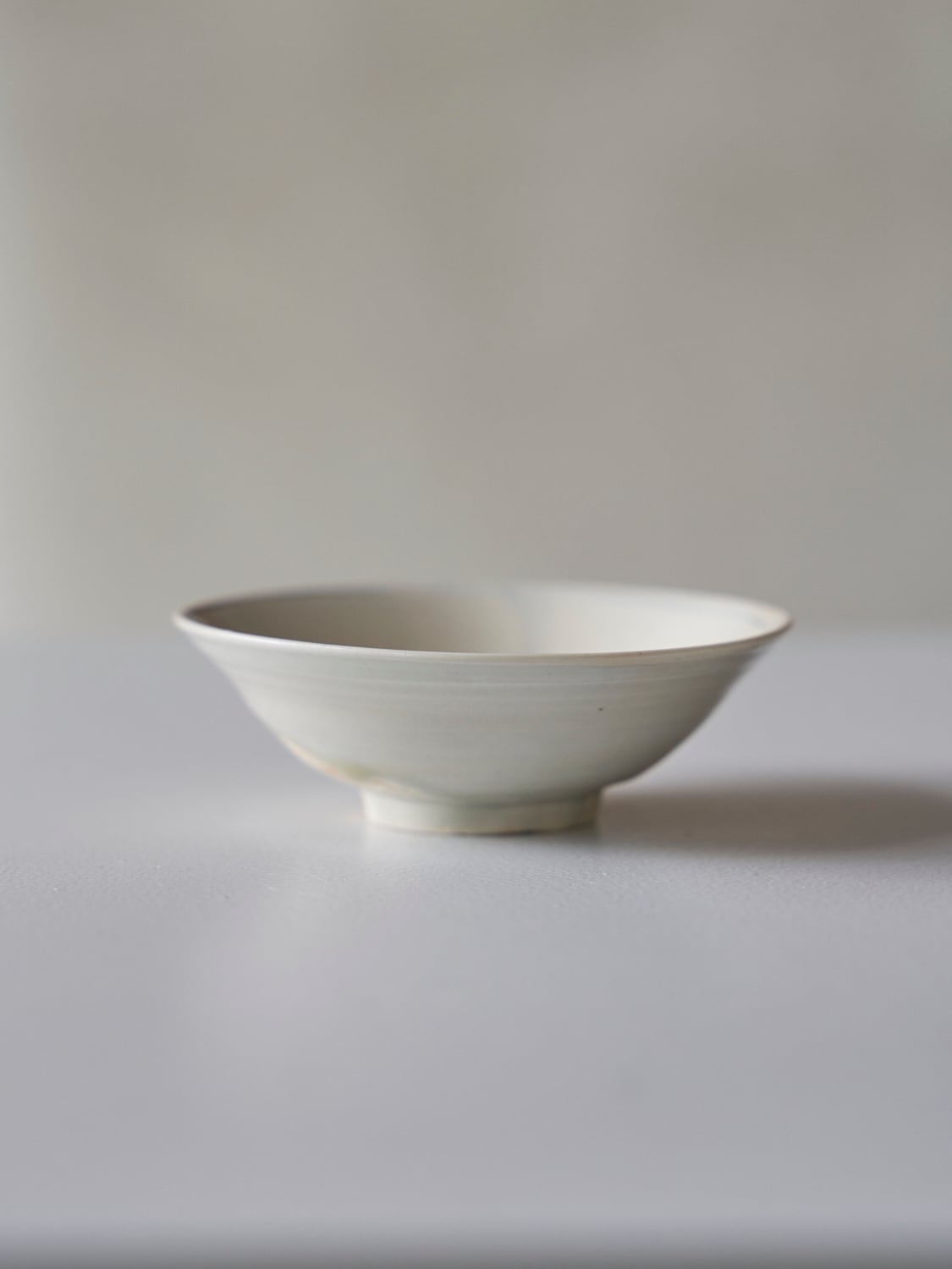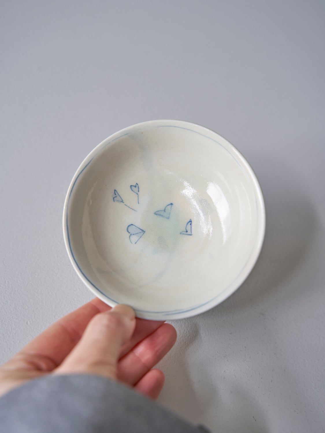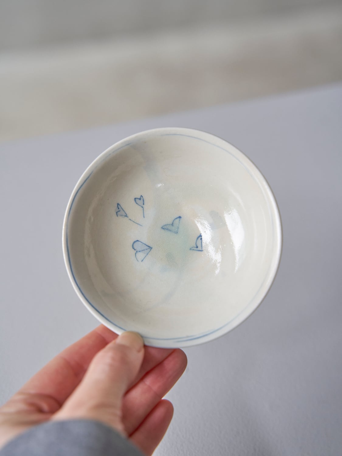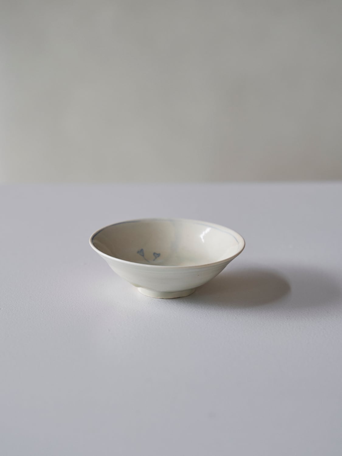 秋田菫による磁器作品。青みや帯びた透明釉薬はガラス質で美しい。有田焼初期のような柔らかく、素朴な雰囲気があります。染付により描かれた植物は、彼女の庭に育ったものです。