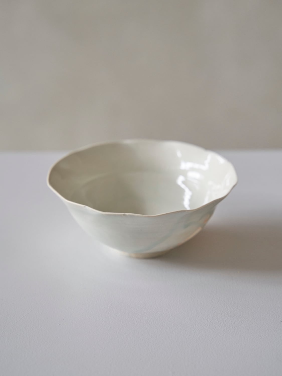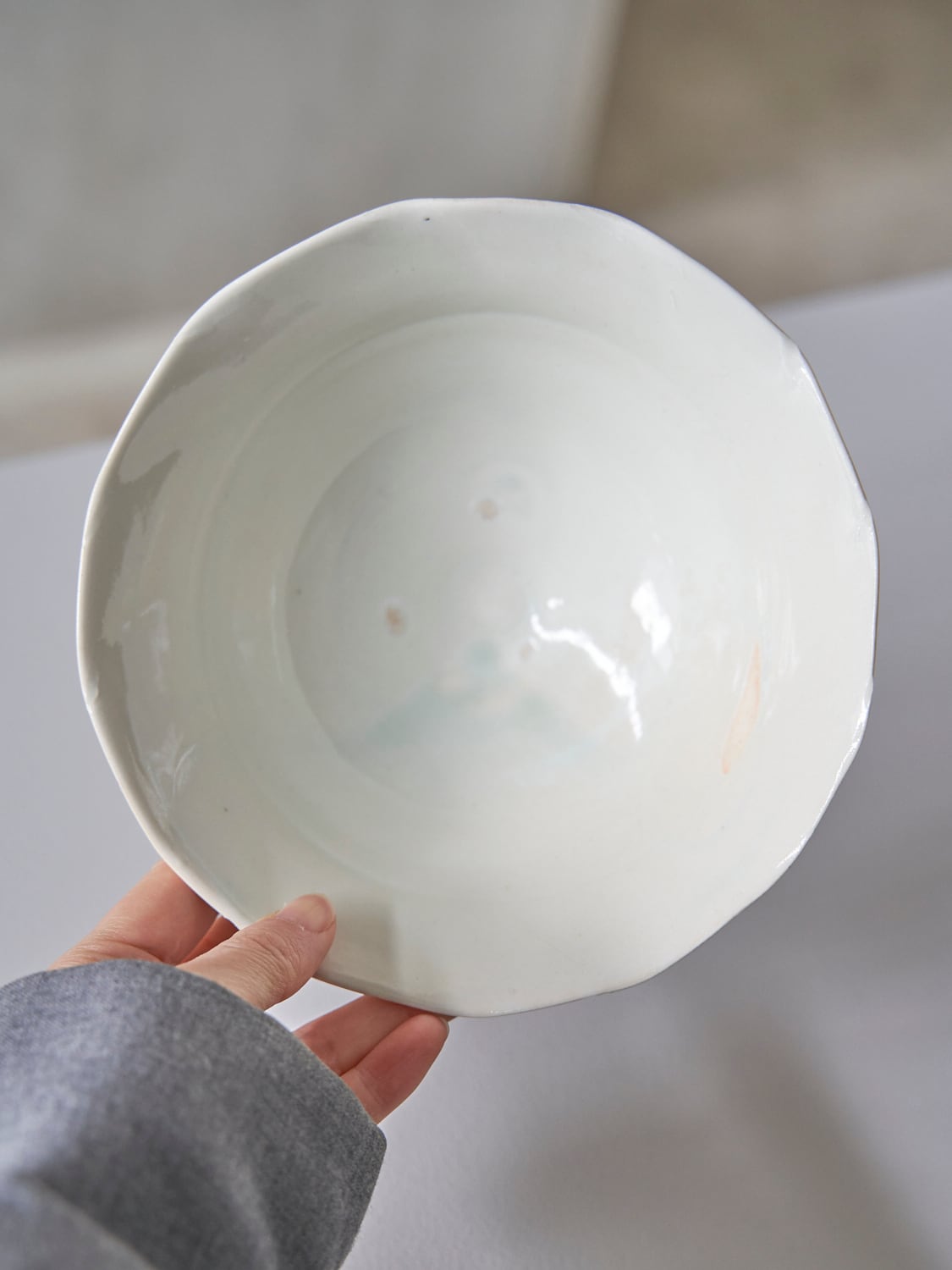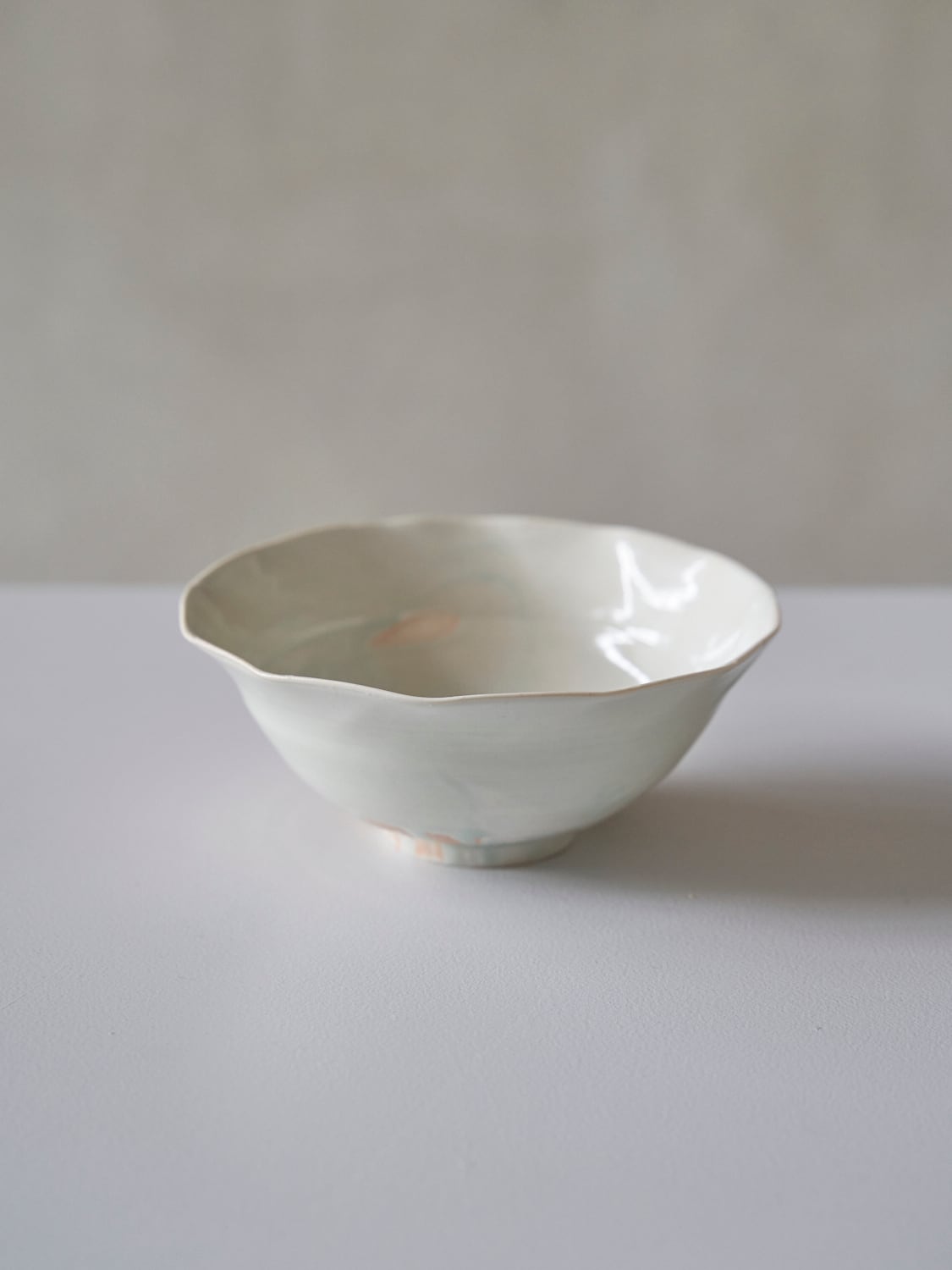秋田菫による磁器作品。自然物(川や水)を思わせる波波の優しい形。ボール皿のようにサラダや煮物にも◎ガラス質の釉薬と相反して、素地(磁器)がピンクに染まっている裏面が美しい。 素材 : 陶器 サイズ : 約 Φ 16.5cm × H 7cm サイズは若干の誤差が生じます。またモニターの環境により実際の色と異なる見え方になる場合があります。ご理解の上ご購入ください。