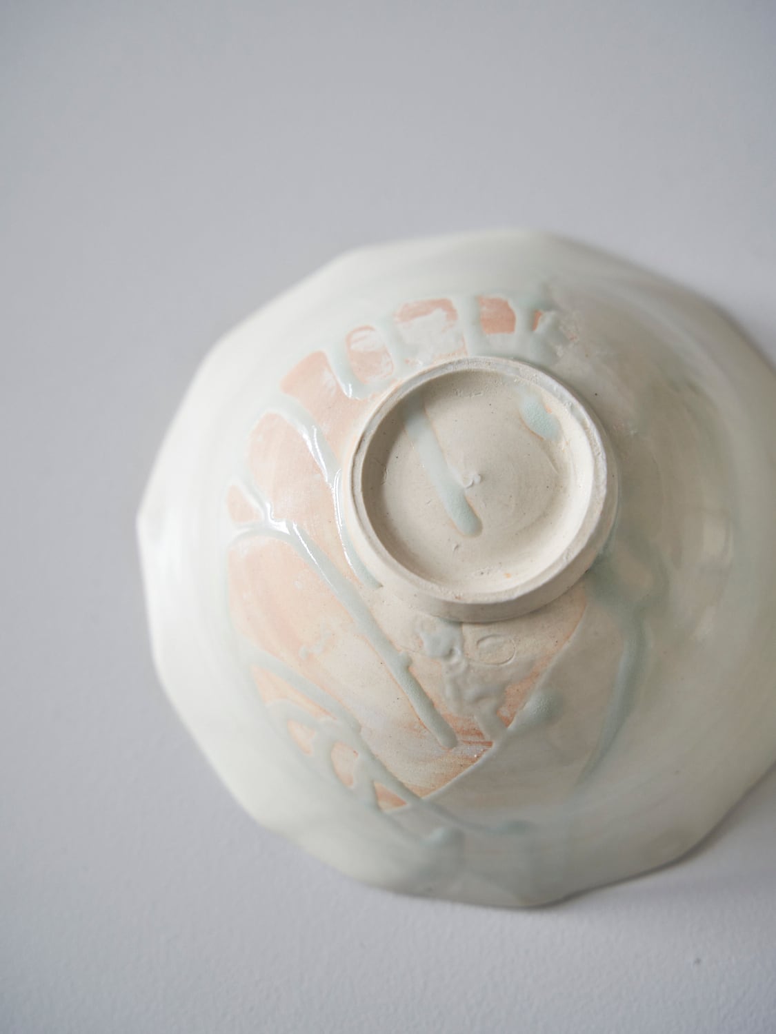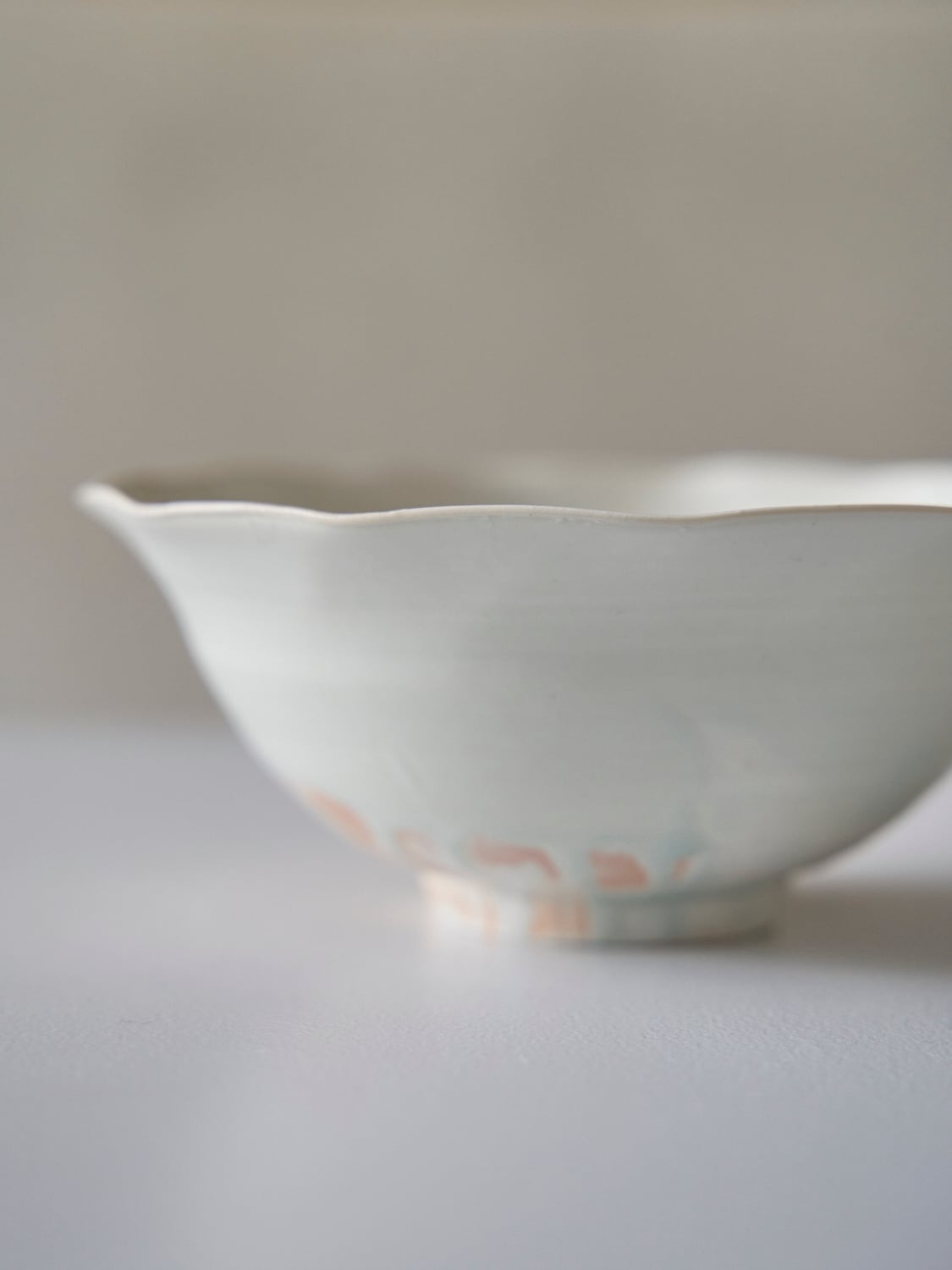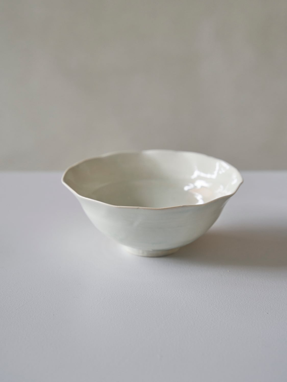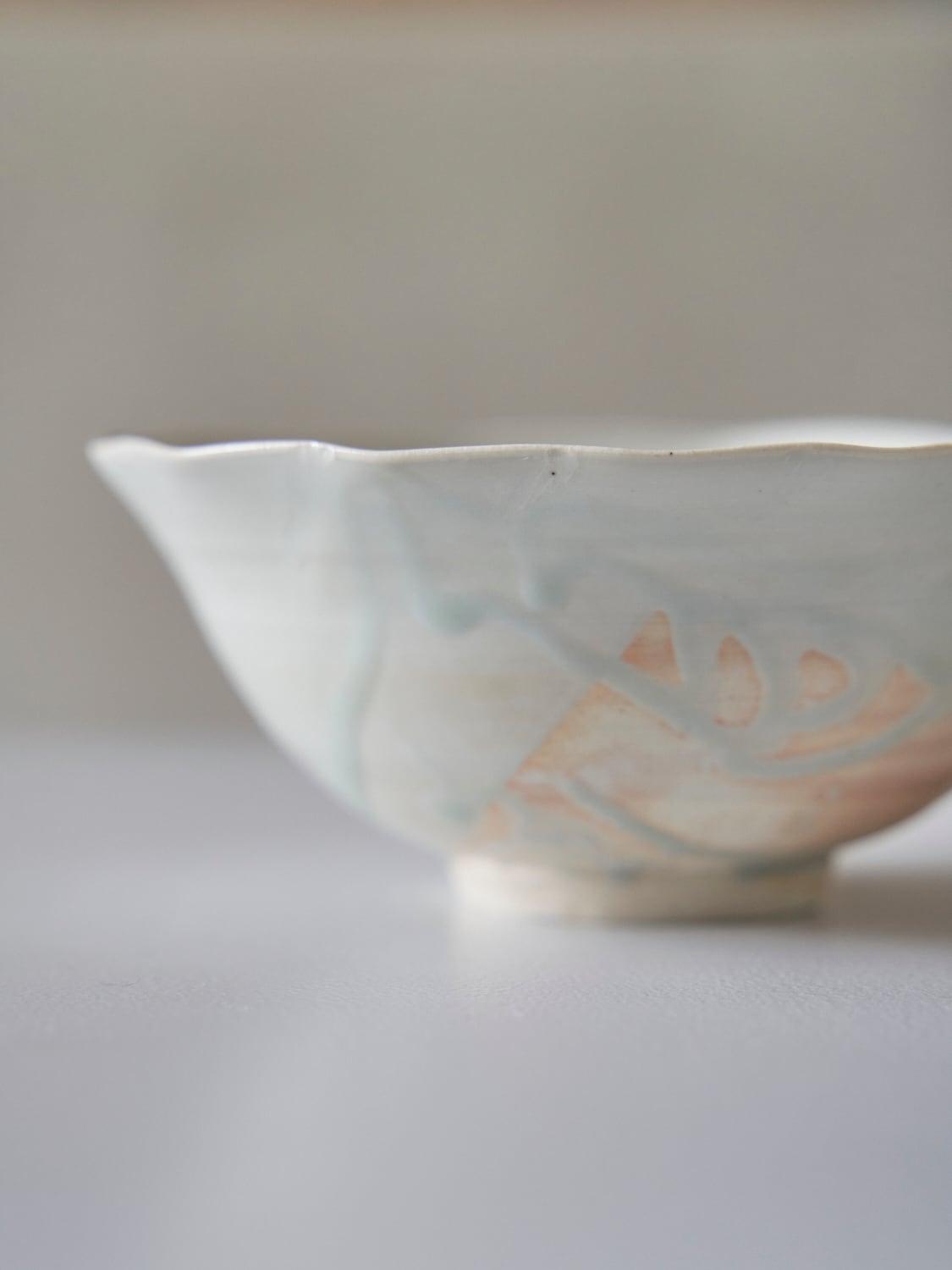 秋田菫による磁器作品。自然物(川や水)を思わせる波波の優しい形。ボール皿のようにサラダや煮物にも◎ガラス質の釉薬と相反して、素地(磁器)がピンクに染まっている裏面が美しい。 素材 : 陶器 サイズ : 約 Φ 16.5cm × H 7cm サイズは若干の誤差が生じます。またモニターの環境により実際の色と異なる見え方になる場合があります。ご理解の上ご購入ください。