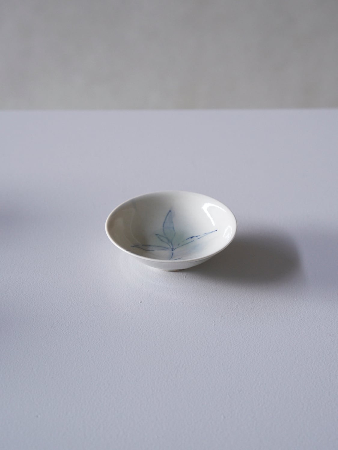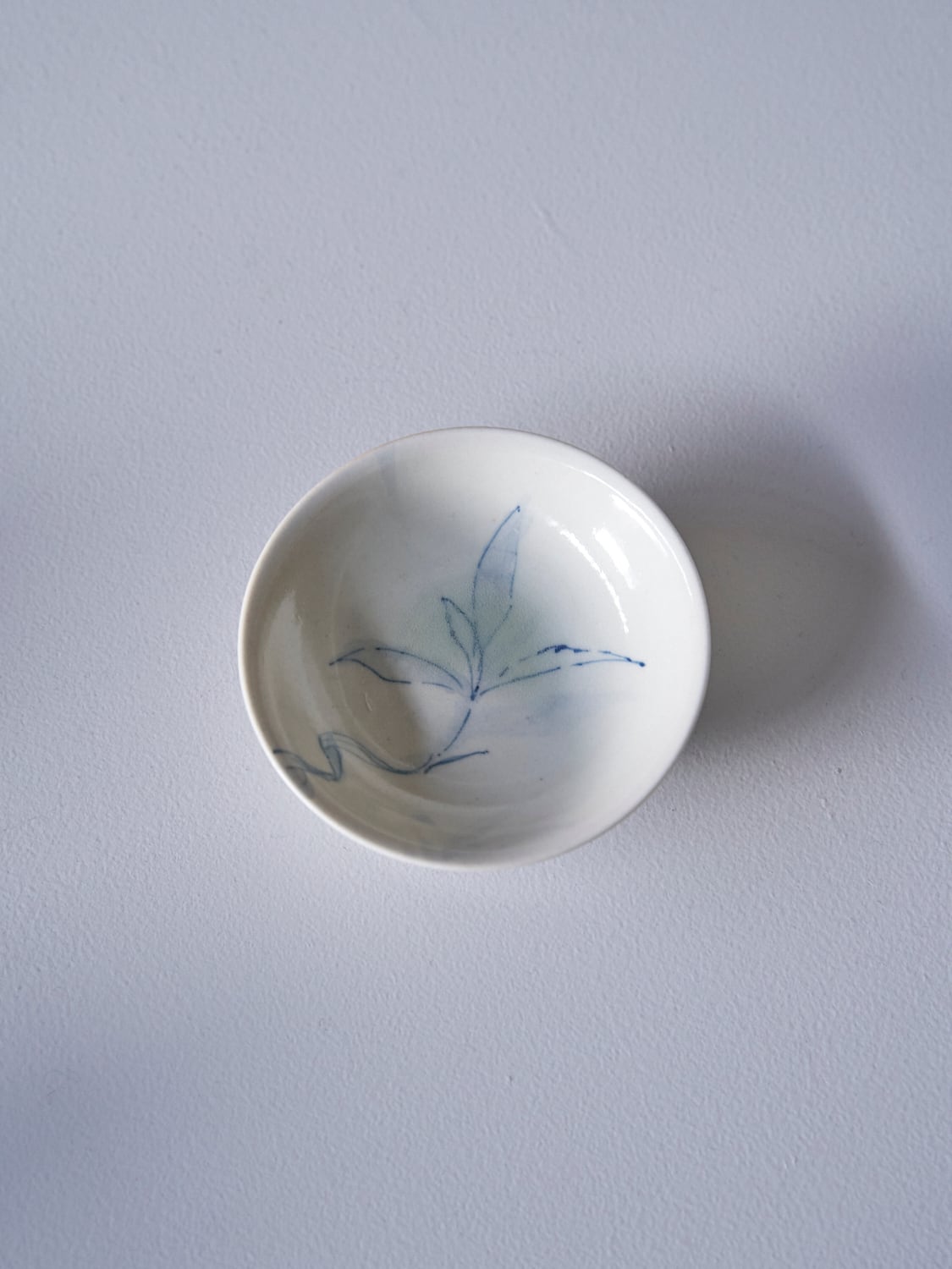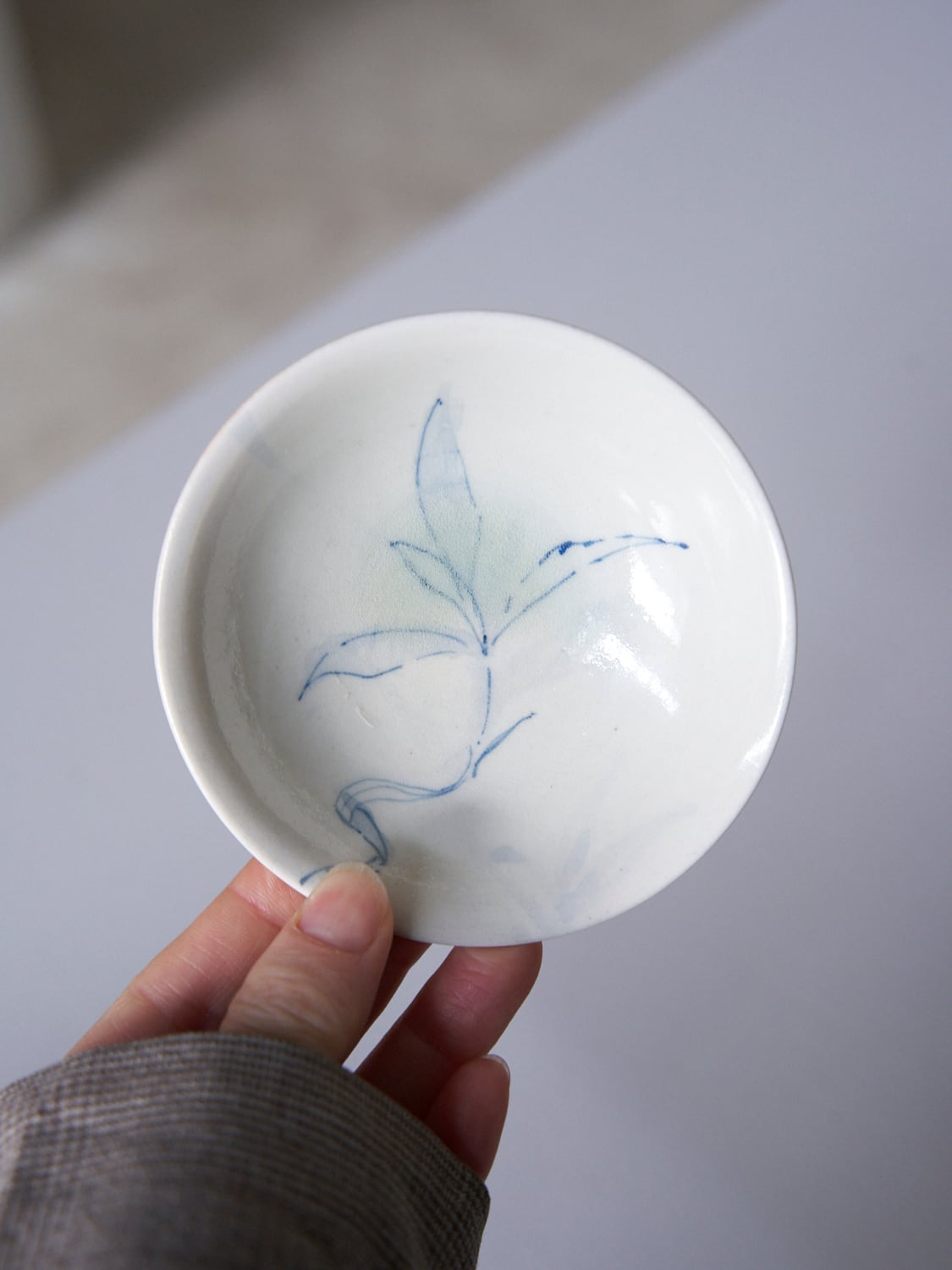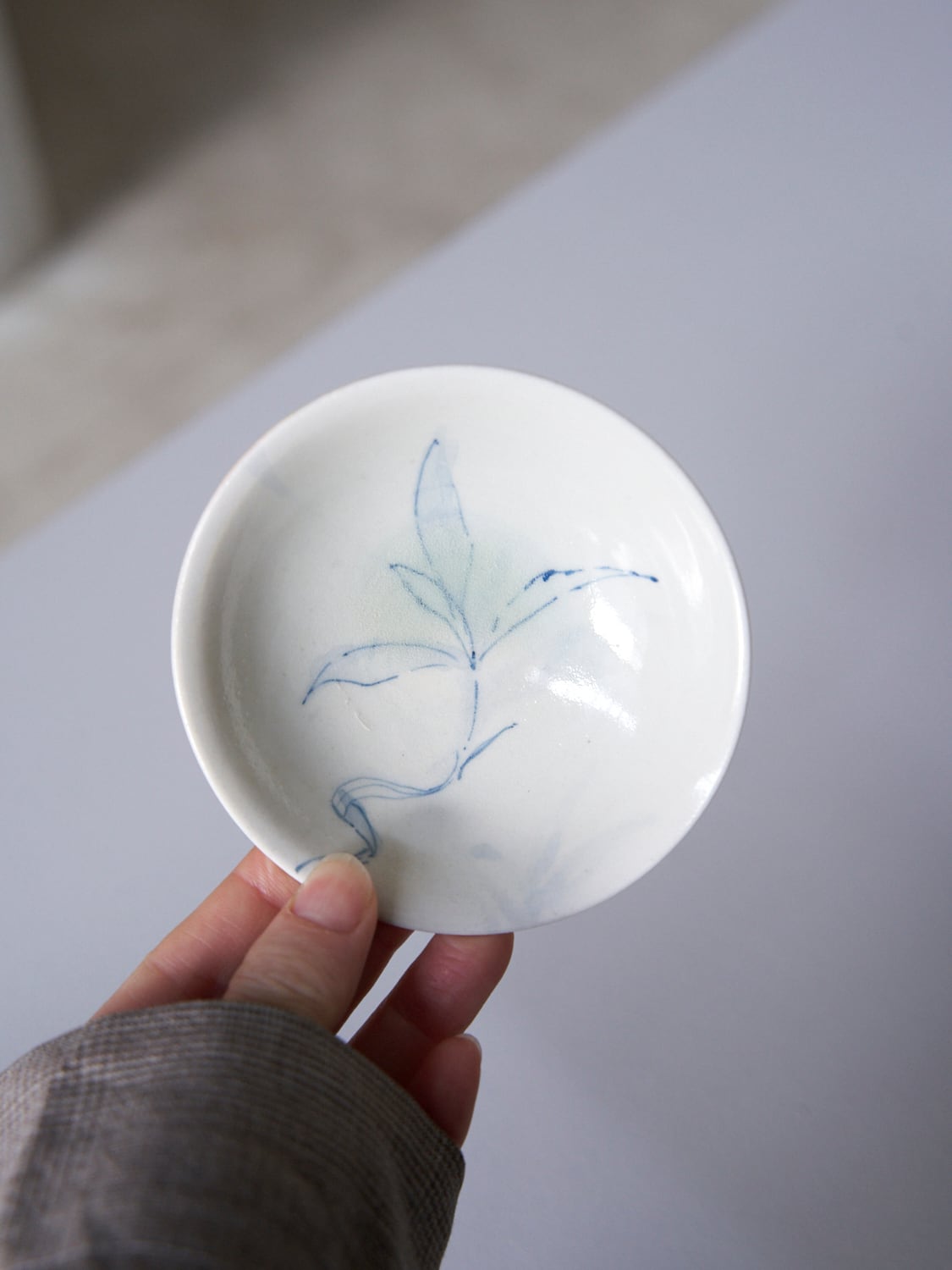 秋田菫による磁器作品。青みや帯びた透明釉薬はガラス質で美しい。有田焼初期のような柔らかく、素朴な雰囲気があります。染付により描かれた植物は、彼女の庭に育ったものです。