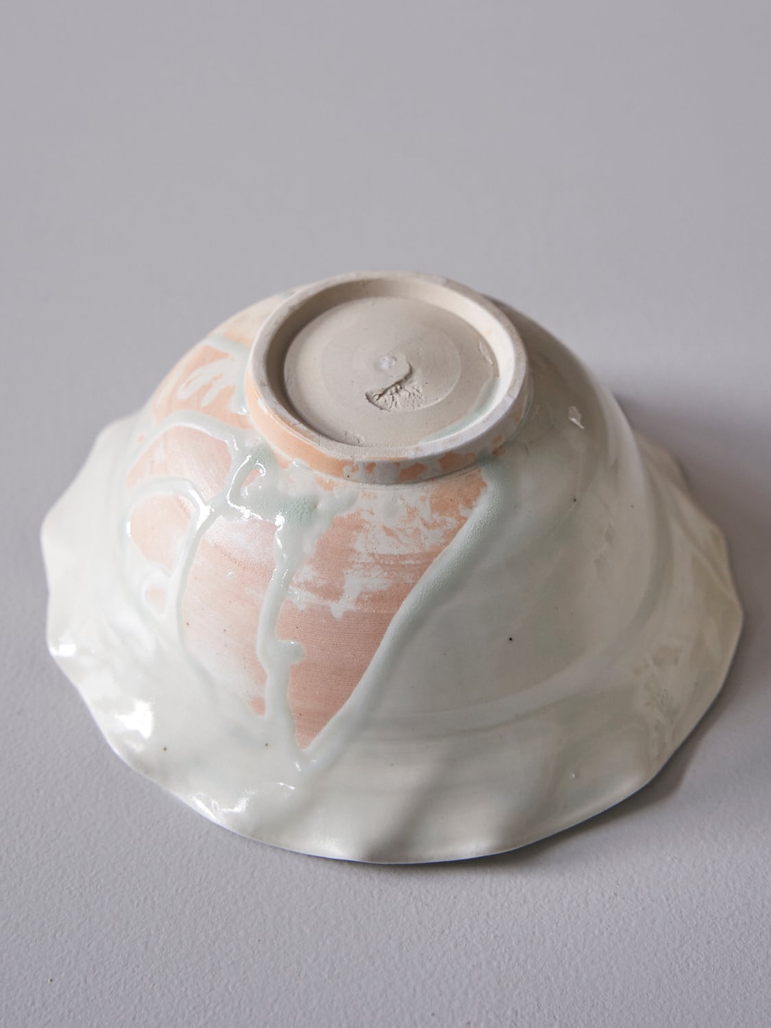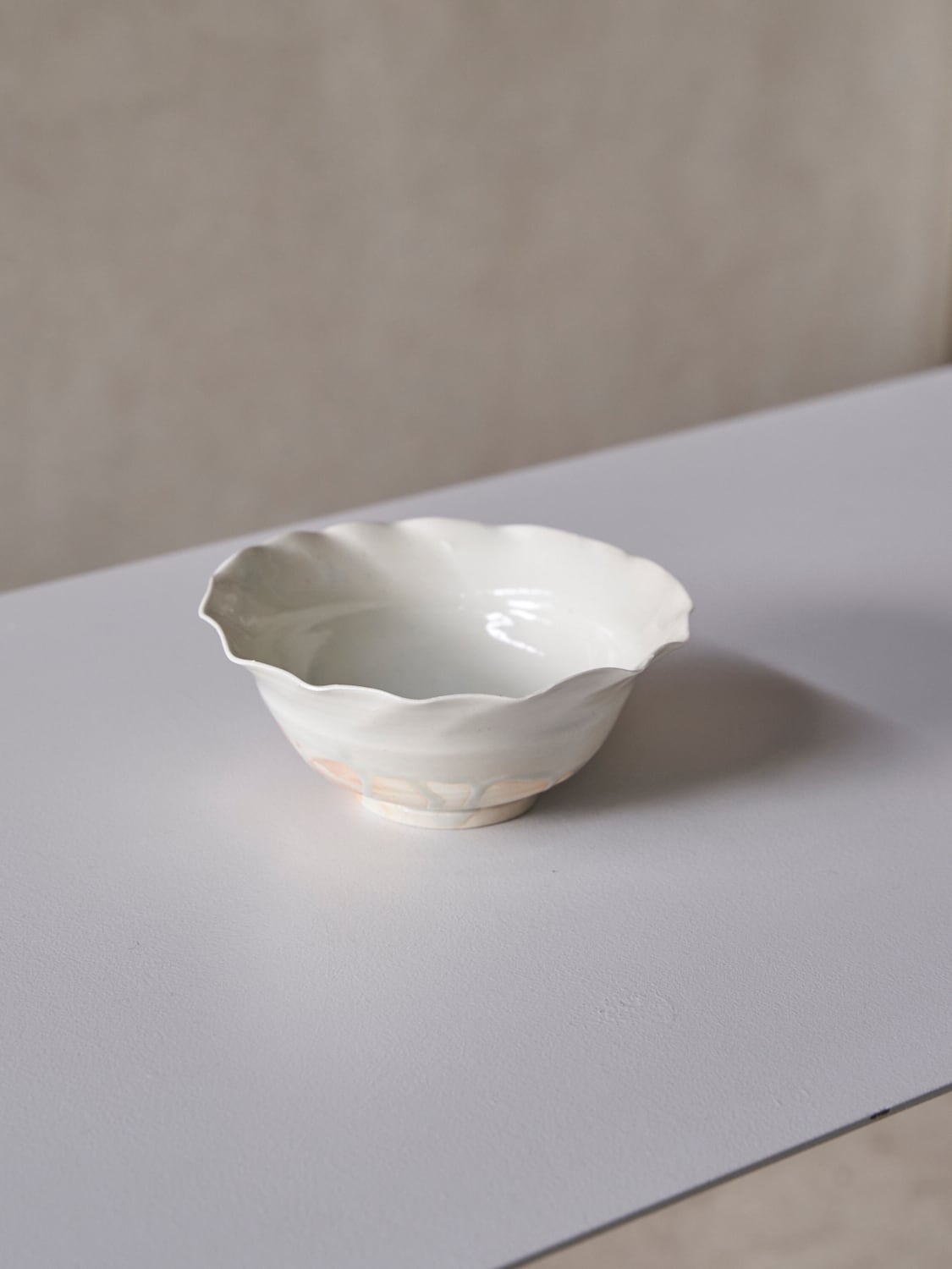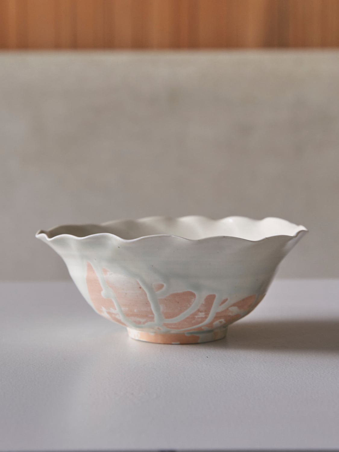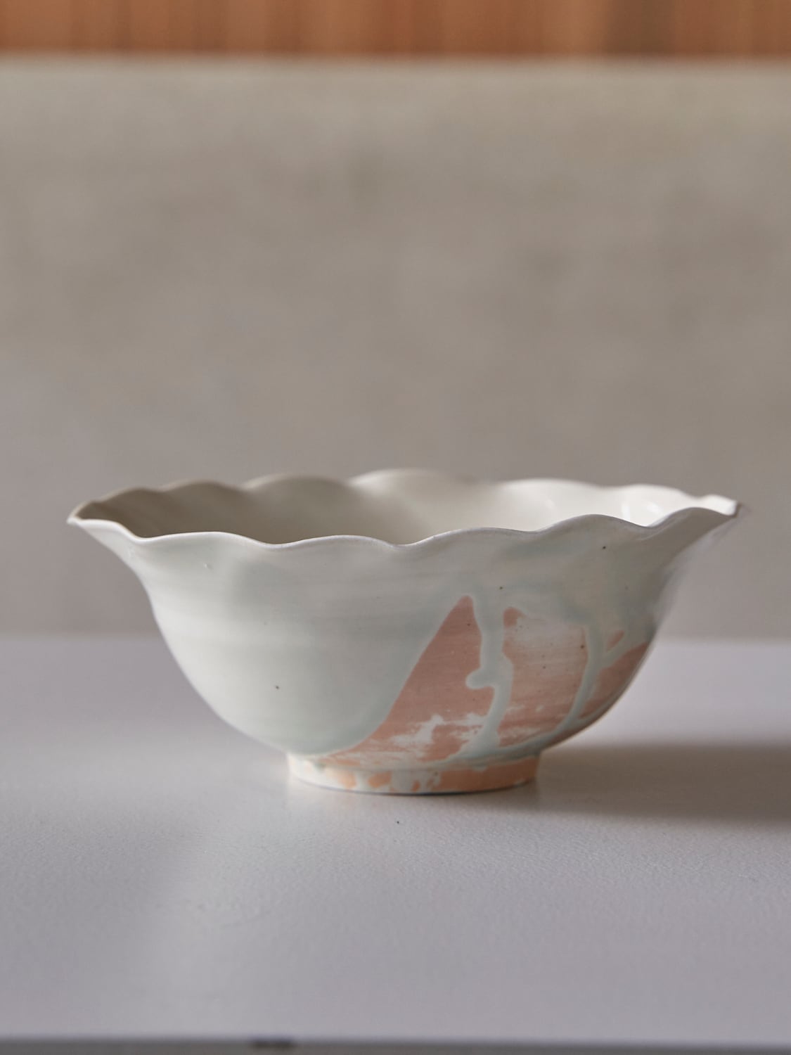 秋田菫による磁器作品。自然物(川や水)を思わせる波波の優しい形。ボール皿のようにサラダや煮物にも◎ガラス質の釉薬と相反して、素地(磁器)がピンクに染まっている裏面が美しい。 素材 : 陶器 サイズ : 約 Φ 16.5cm × H 7cm サイズは若干の誤差が生じます。またモニターの環境により実際の色と異なる見え方になる場合があります。ご理解の上ご購入ください。