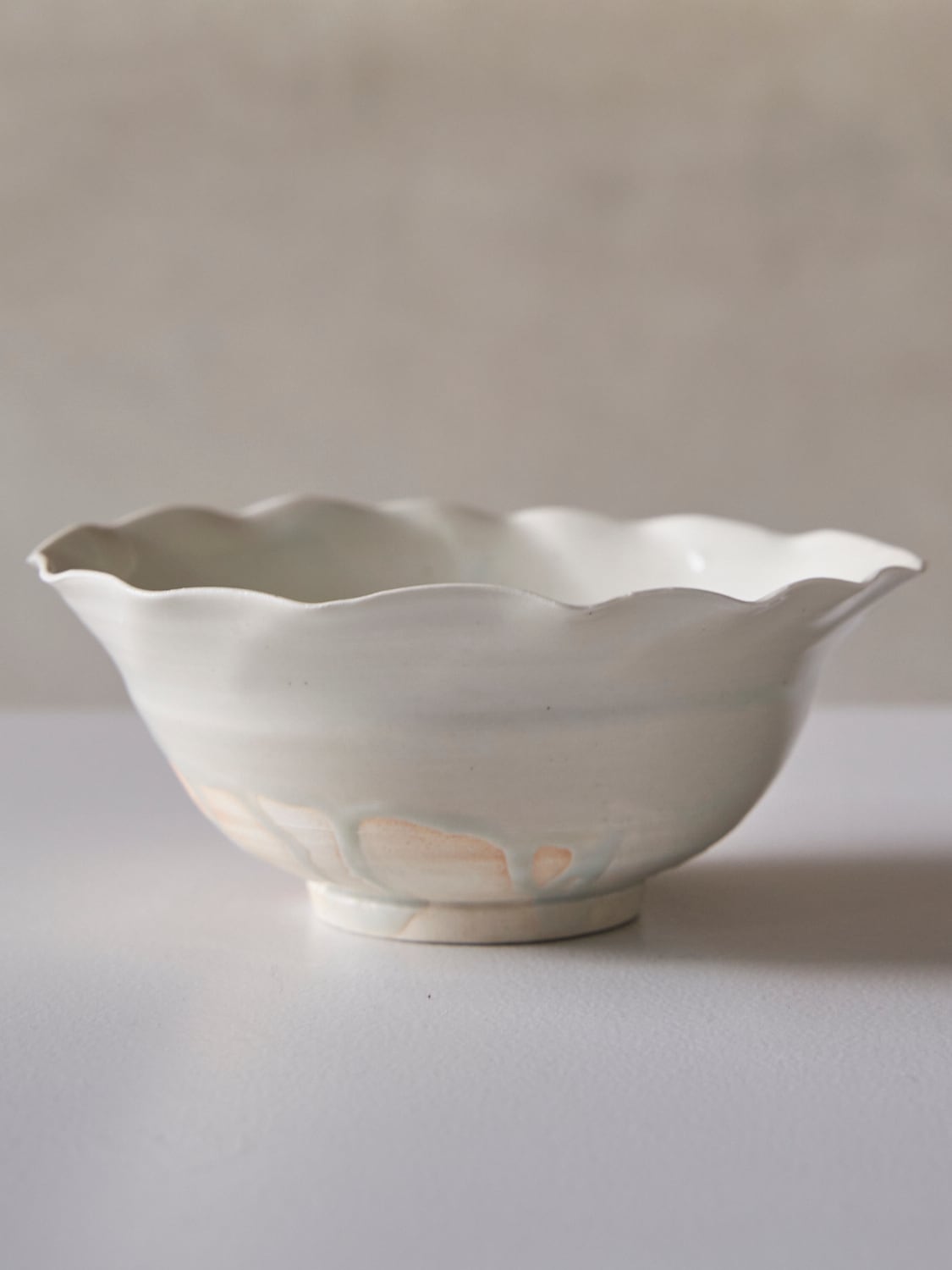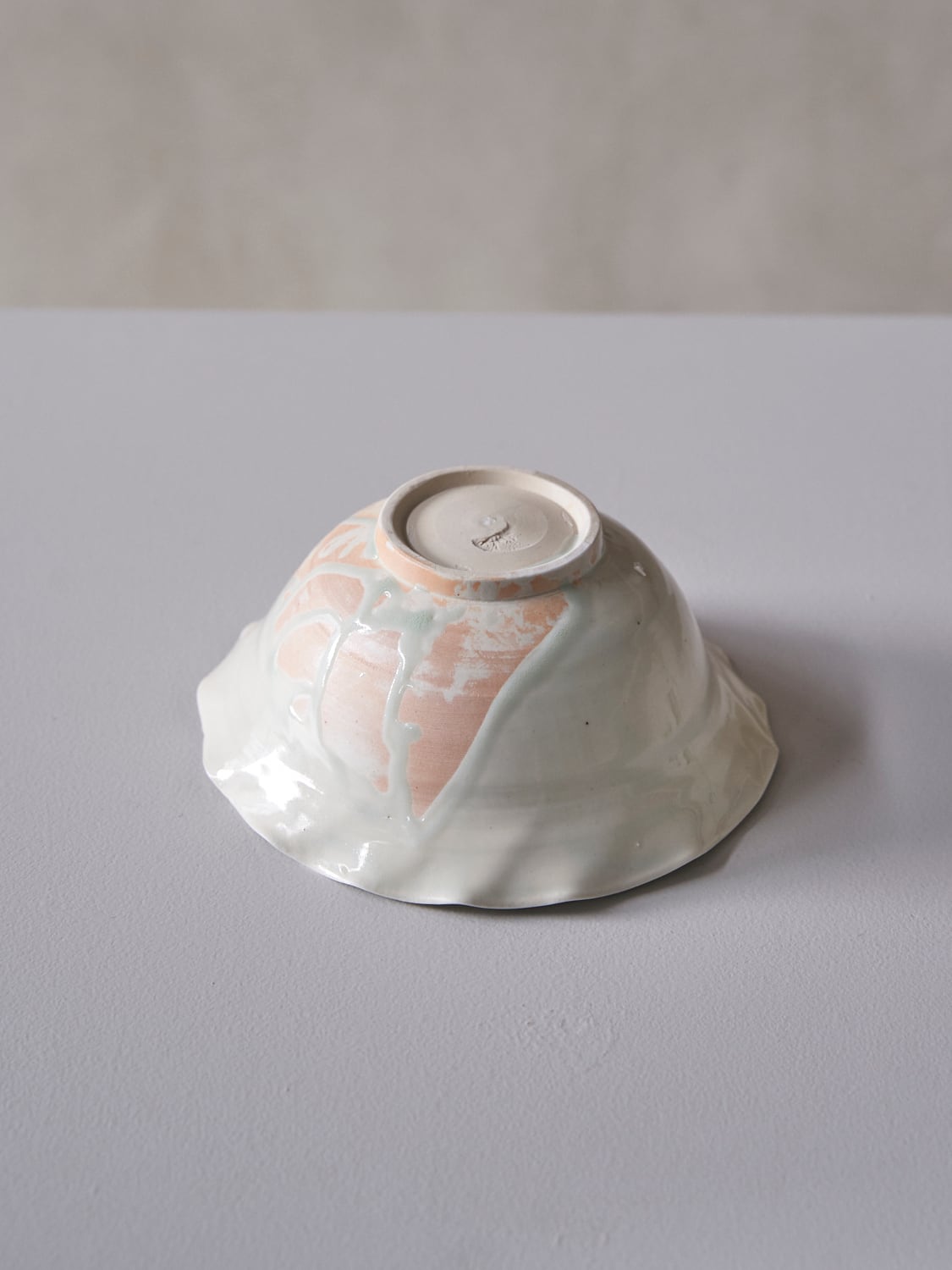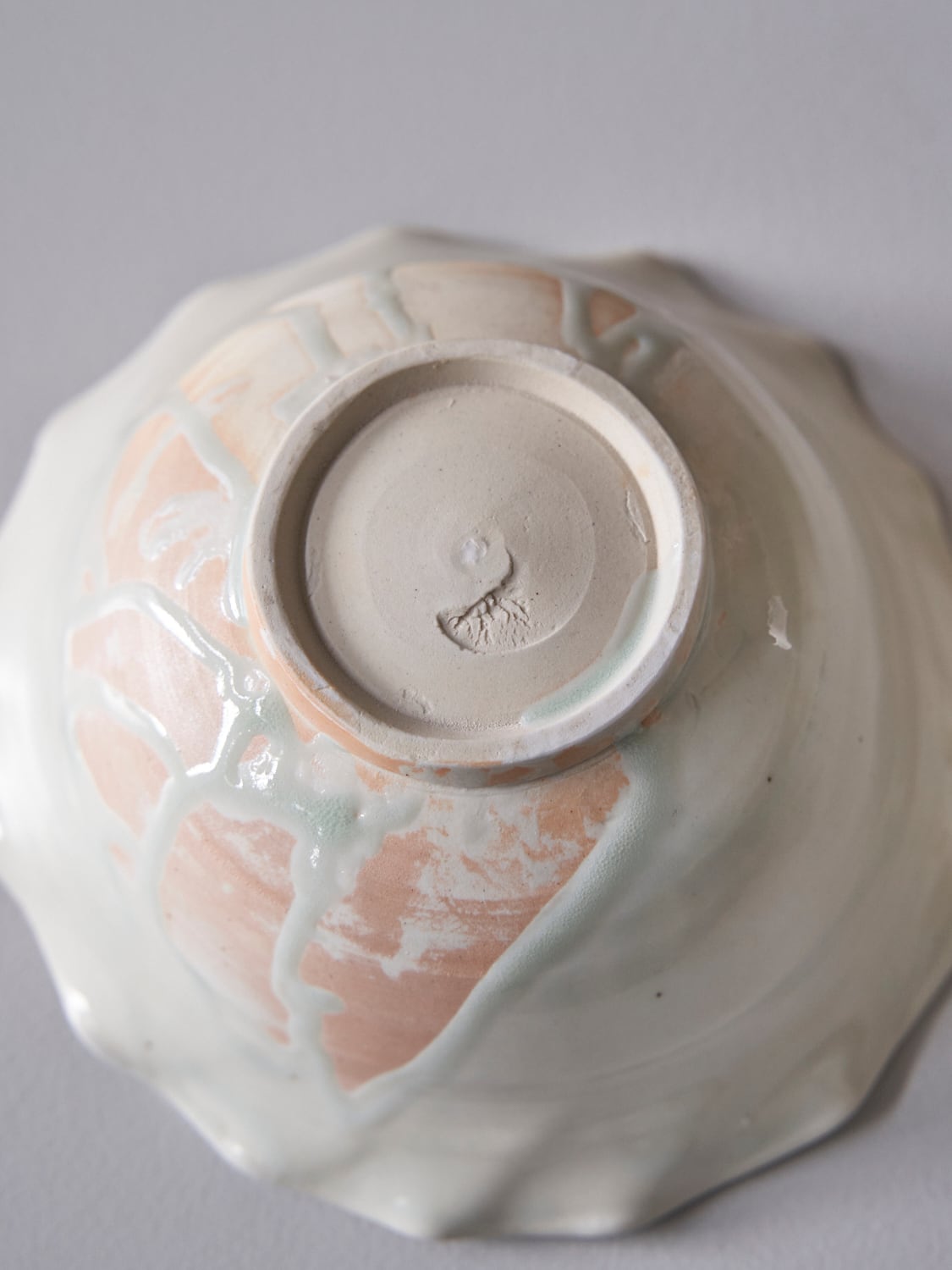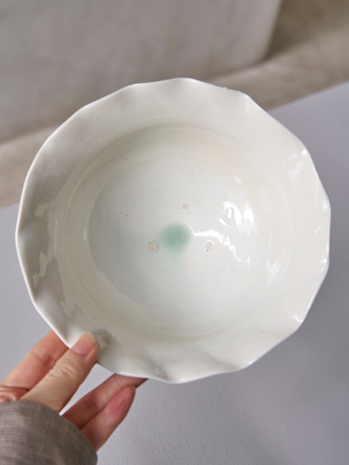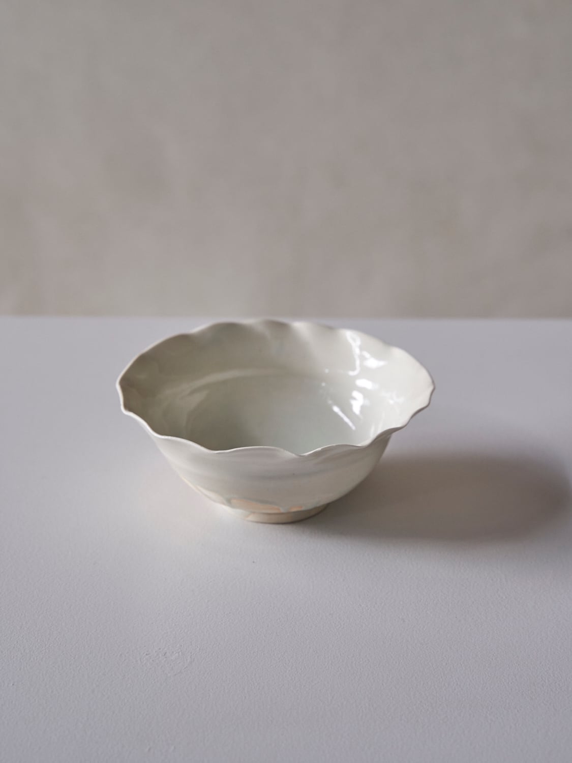 秋田菫による磁器作品。自然物(川や水)を思わせる波波の優しい形。ボール皿のようにサラダや煮物にも◎ガラス質の釉薬と相反して、素地(磁器)がピンクに染まっている裏面が美しい。 素材 : 陶器 サイズ : 約 Φ 16.5cm × H 7cm サイズは若干の誤差が生じます。またモニターの環境により実際の色と異なる見え方になる場合があります。ご理解の上ご購入ください。