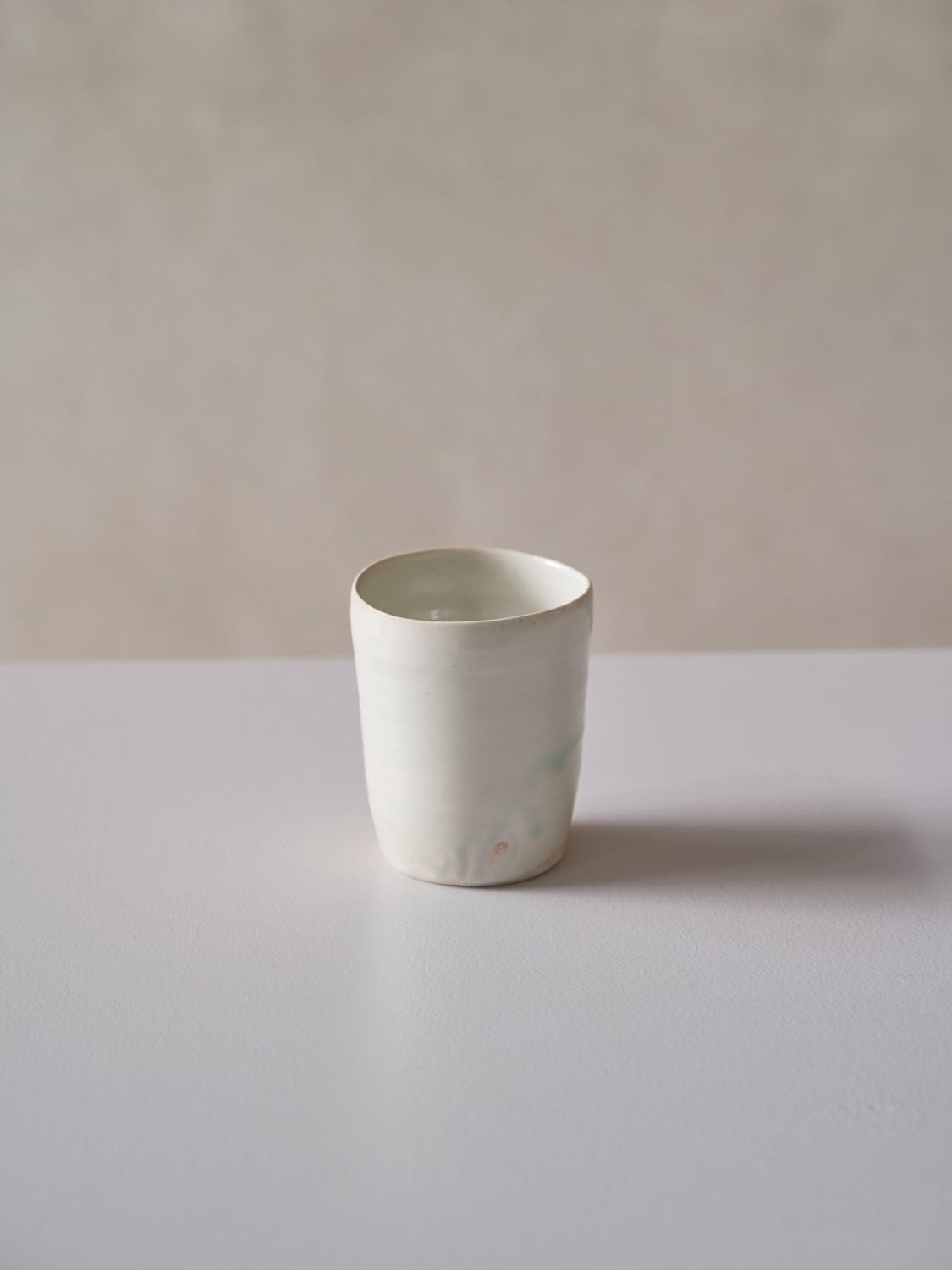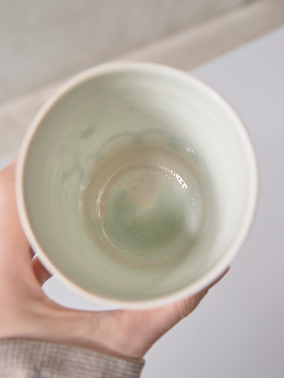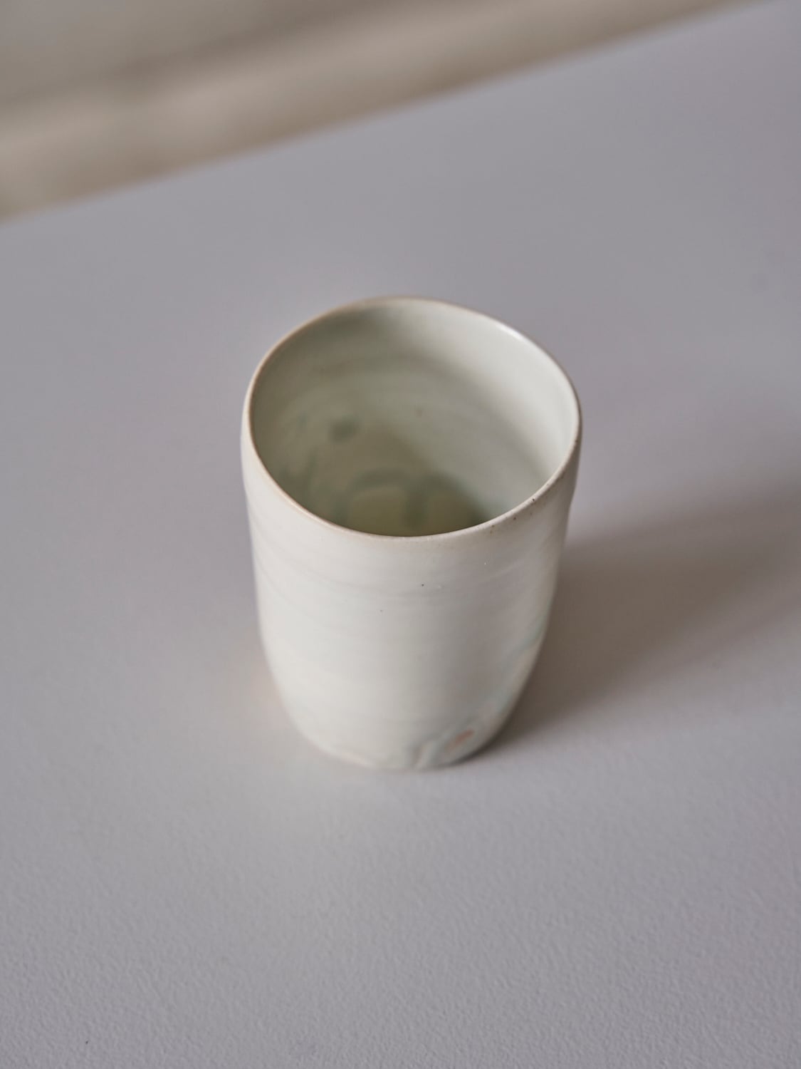 秋田菫による磁器作品。ガラス質な青い透明釉薬が美しい。ビールやハイボール、ジュースやお水など色々な飲み物を受け入れてくれそうな作品。小さめ花器としても。 素材 : 陶器 サイズ : 約 Φ 8cm × H 9.5cm 容量:170cc サイズは若干の誤差が生じます。またモニターの環境により実際の色と異なる見え方になる場合があります。ご理解の上ご購入ください。