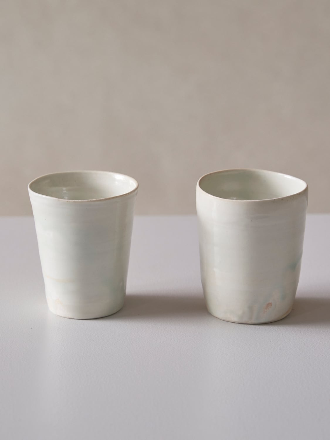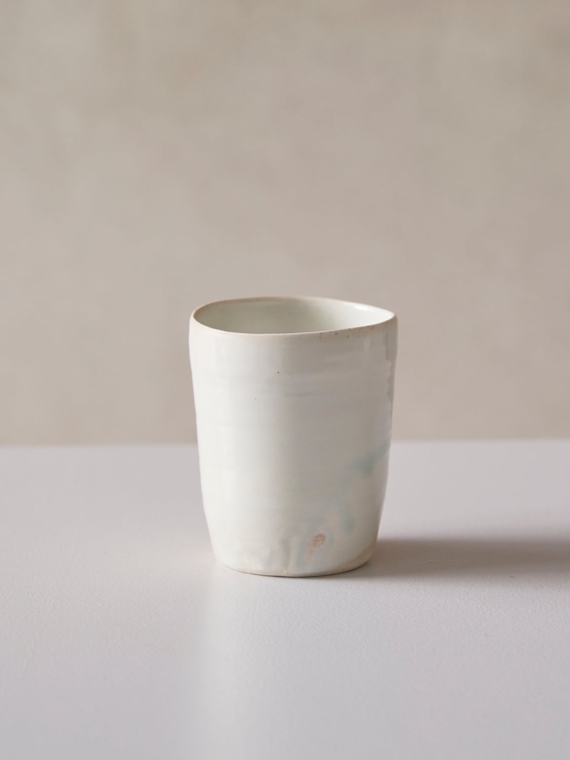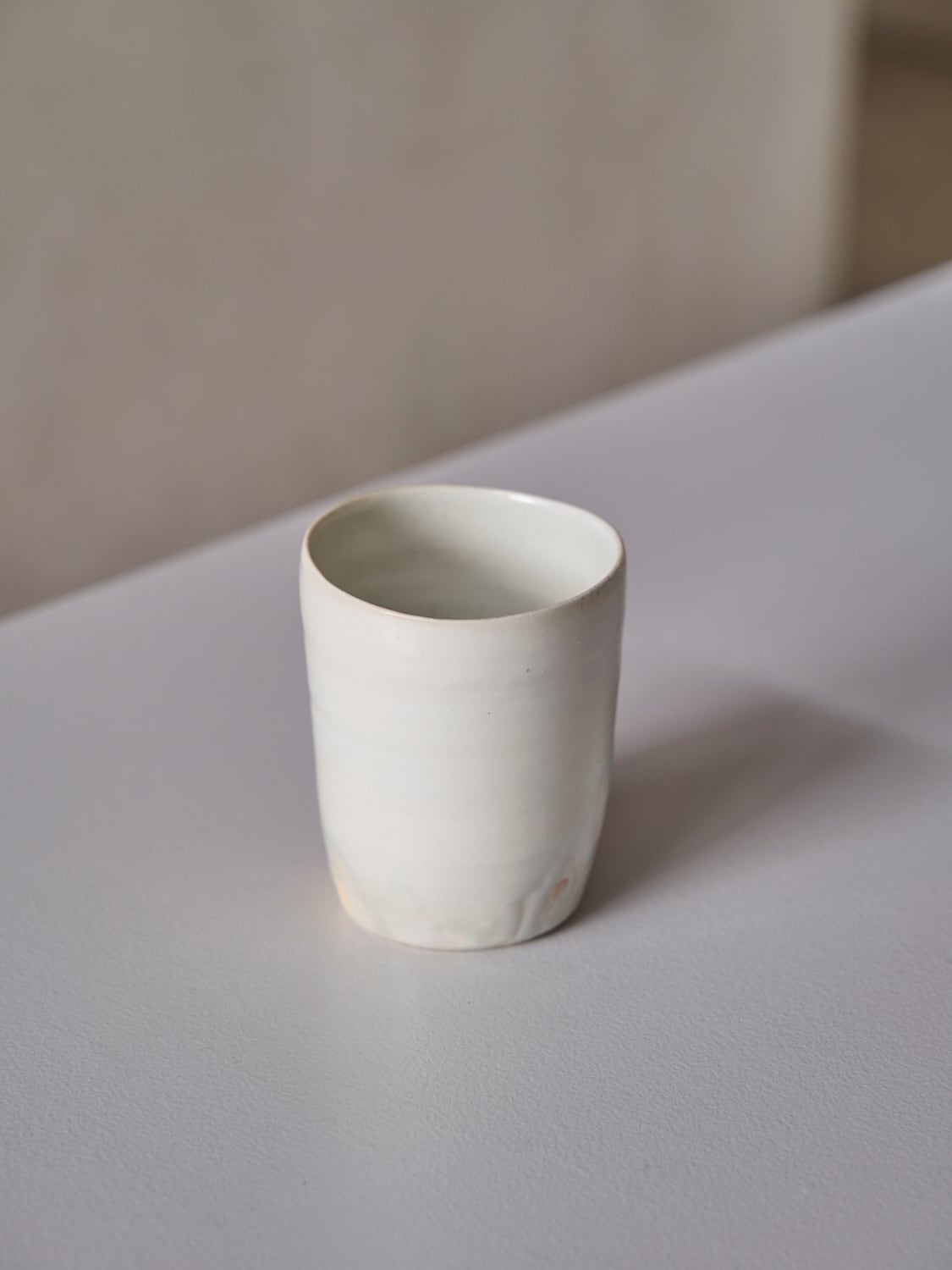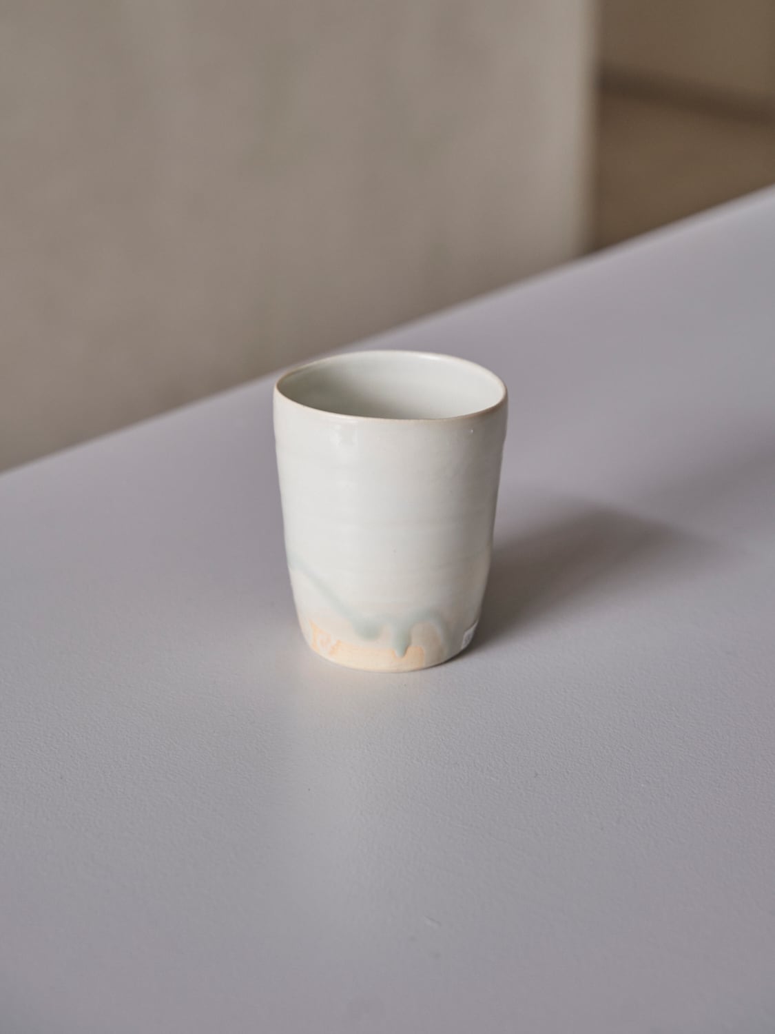 秋田菫による磁器作品。ガラス質な青い透明釉薬が美しい。ビールやハイボール、ジュースやお水など色々な飲み物を受け入れてくれそうな作品。小さめ花器としても。 素材 : 陶器 サイズ : 約 Φ 8cm × H 9.5cm 容量:170cc サイズは若干の誤差が生じます。またモニターの環境により実際の色と異なる見え方になる場合があります。ご理解の上ご購入ください。