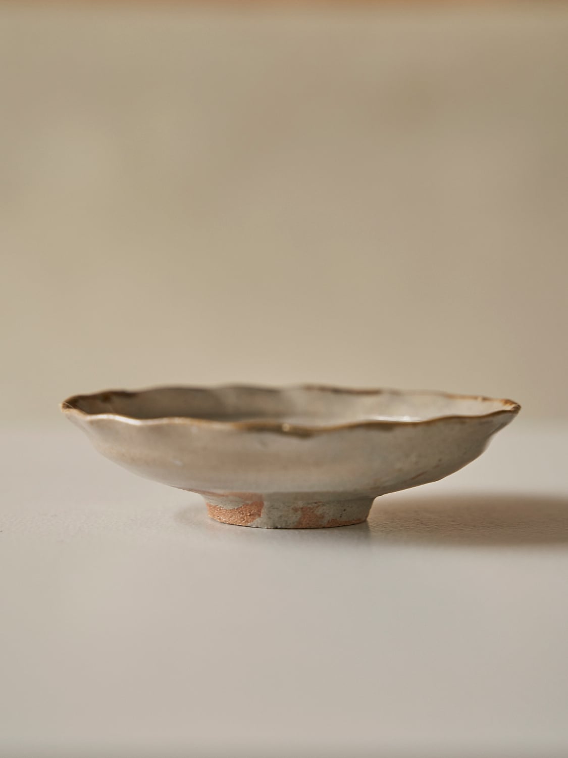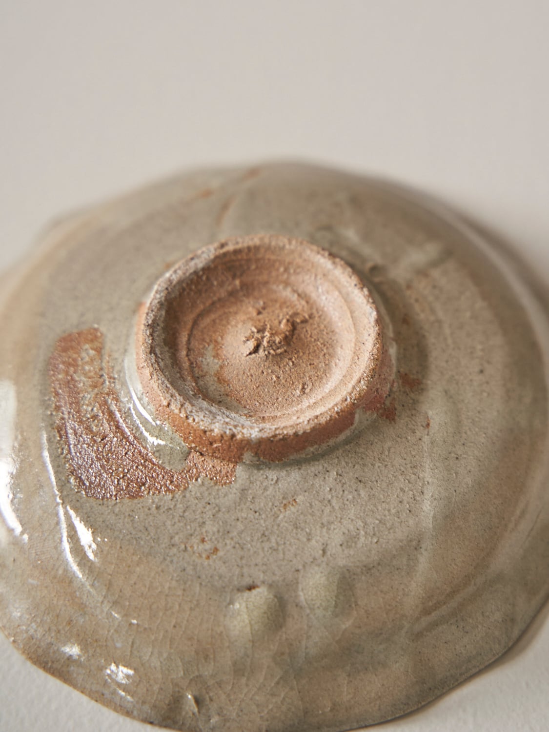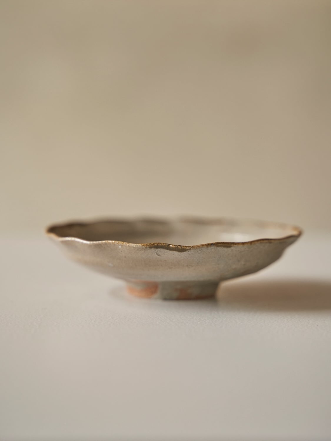 秋田菫による佐賀県唐津の土を使った陶器作品。古唐津のような素朴さをまとった佇まいのカップ。優しい形と色は「用の美」を感じさせてくれる。柔らかいグレーの色が美しい。裏の高台も見どころです。