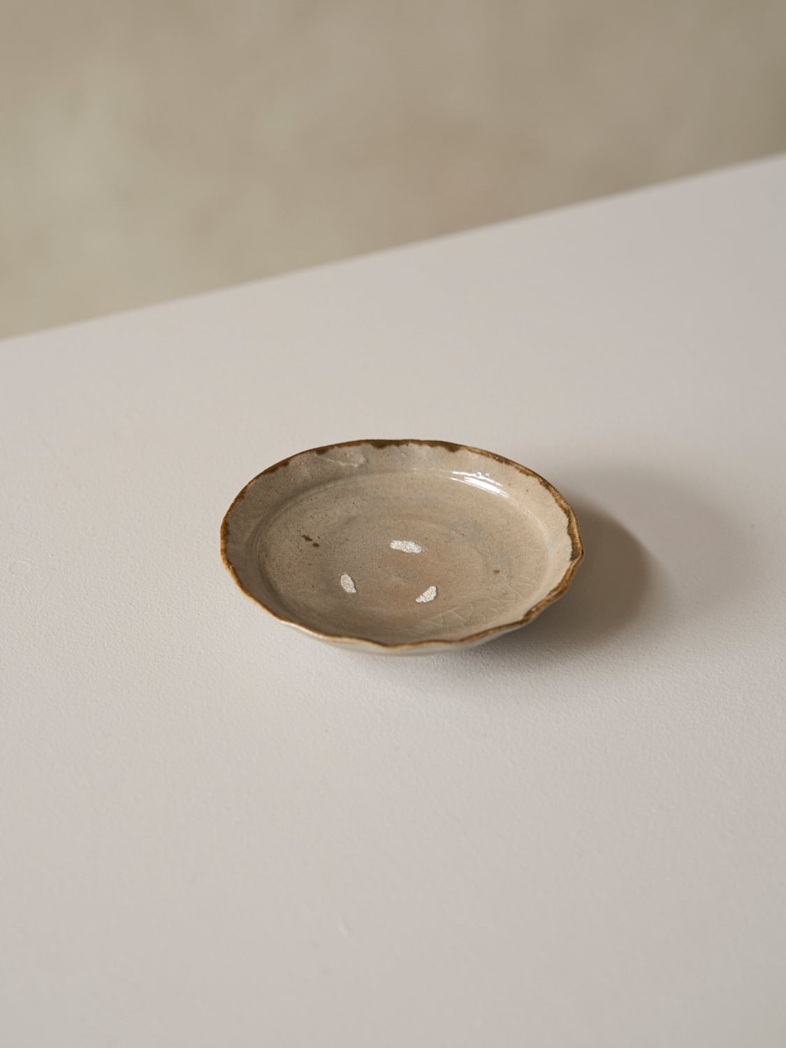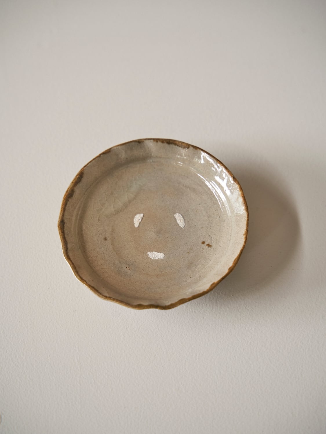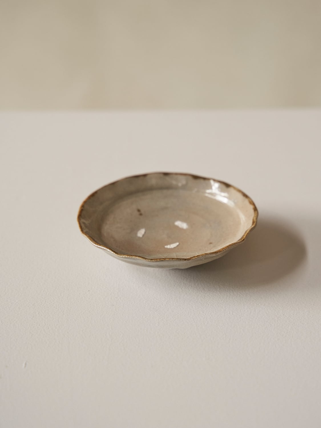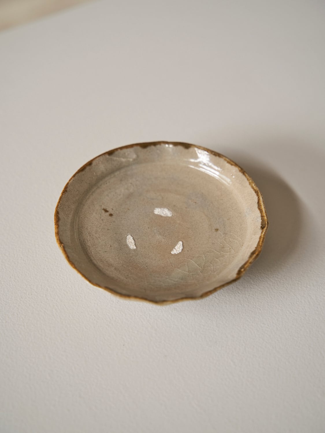 秋田菫による佐賀県唐津の土を使った陶器作品。古唐津のような素朴さをまとった佇まいのカップ。優しい形と色は「用の美」を感じさせてくれる。柔らかいグレーの色が美しい。裏の高台も見どころです。