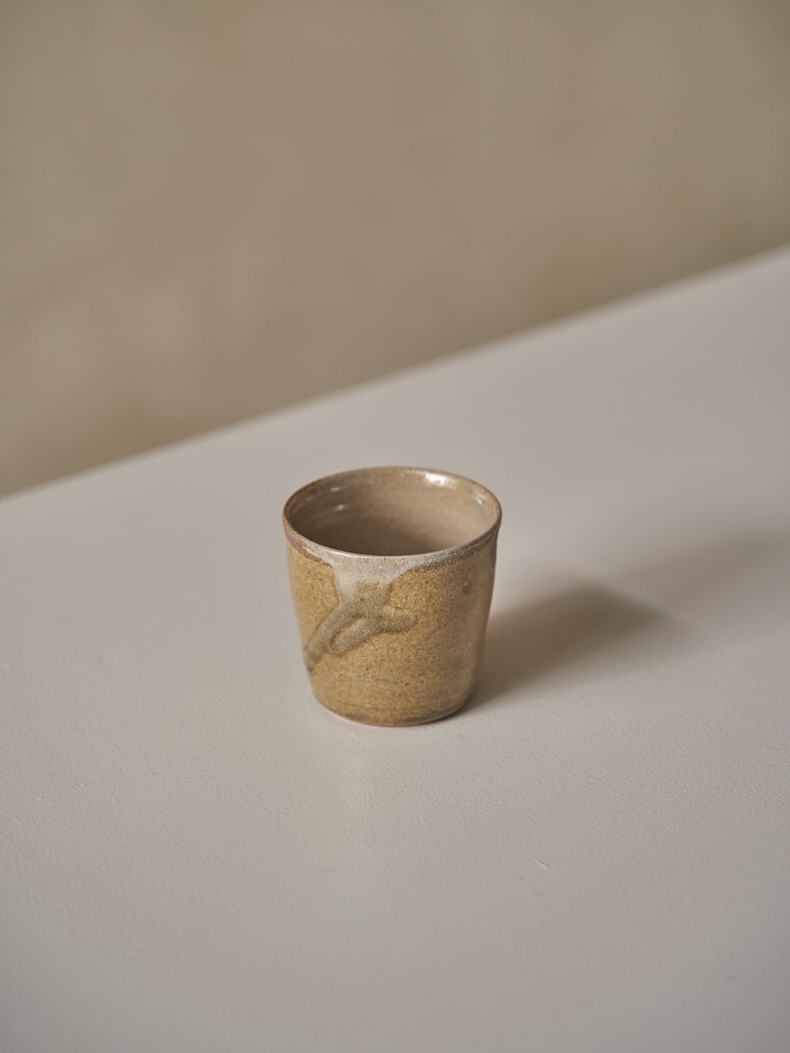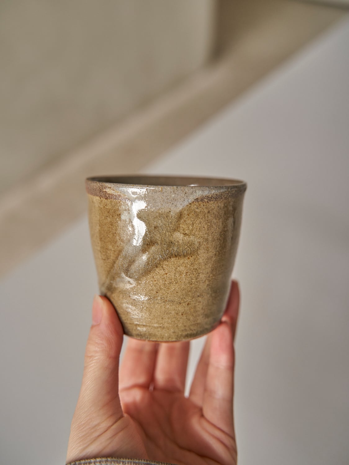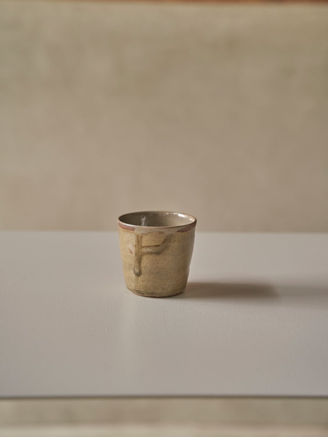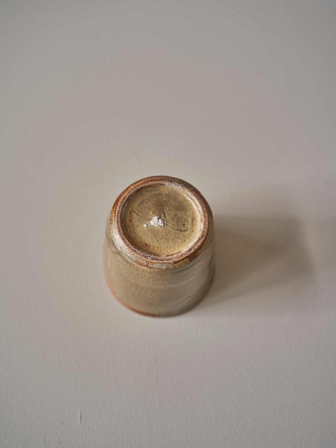 秋田菫による佐賀県唐津の土を使った陶器作品。古唐津のような素朴さをまとった佇まいのカップ。優しい形と色は「用の美」を感じさせてくれる。