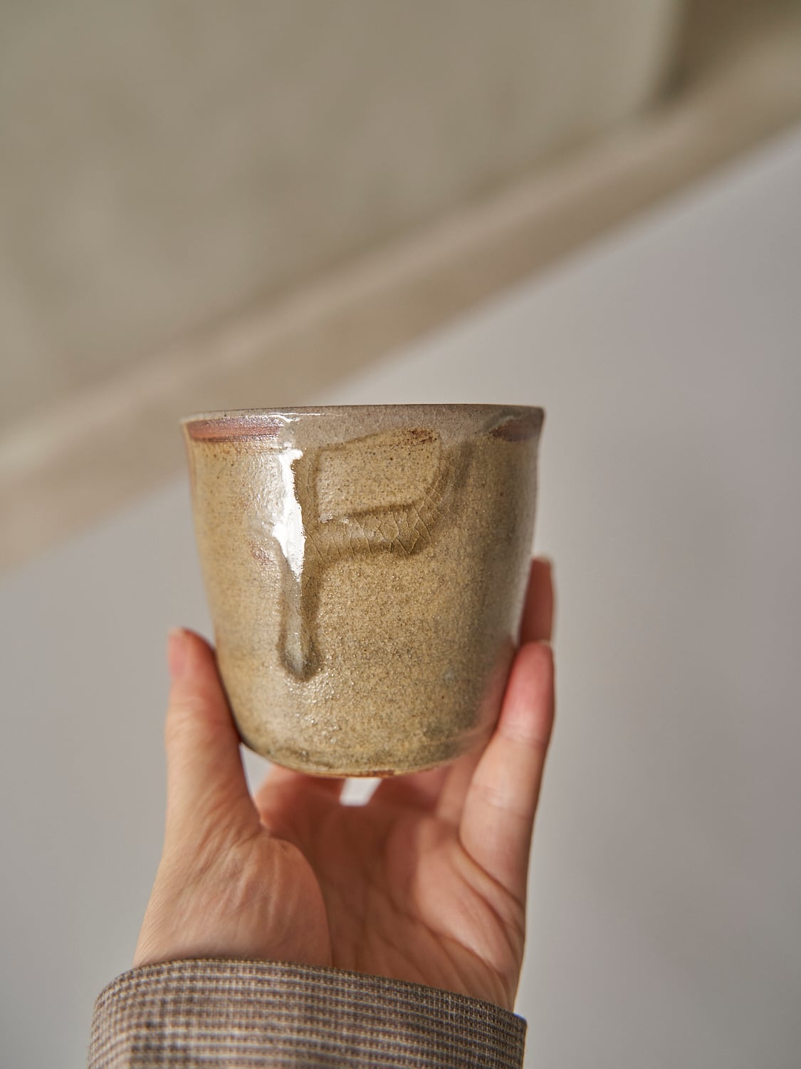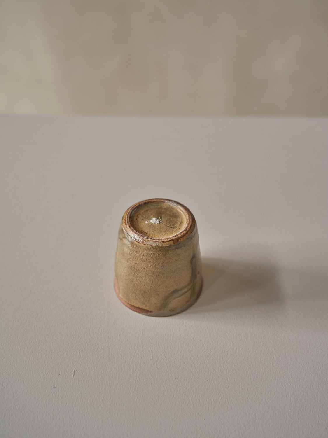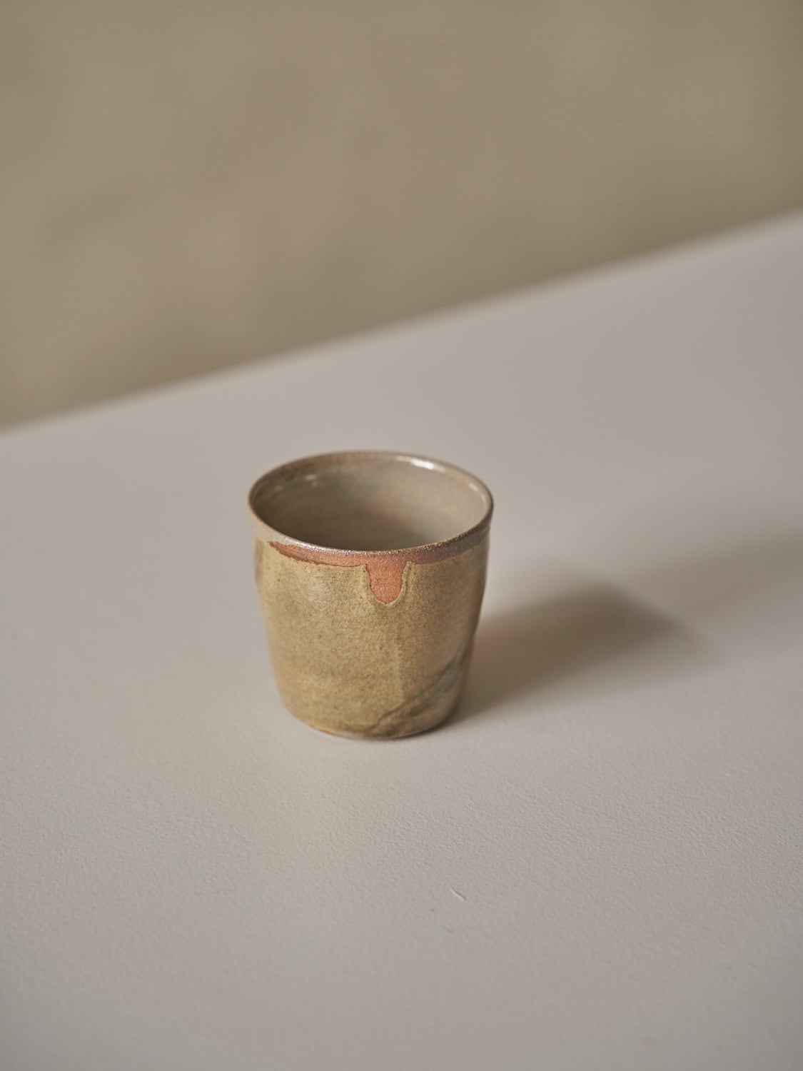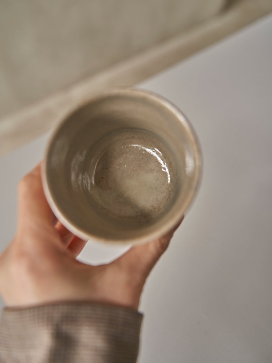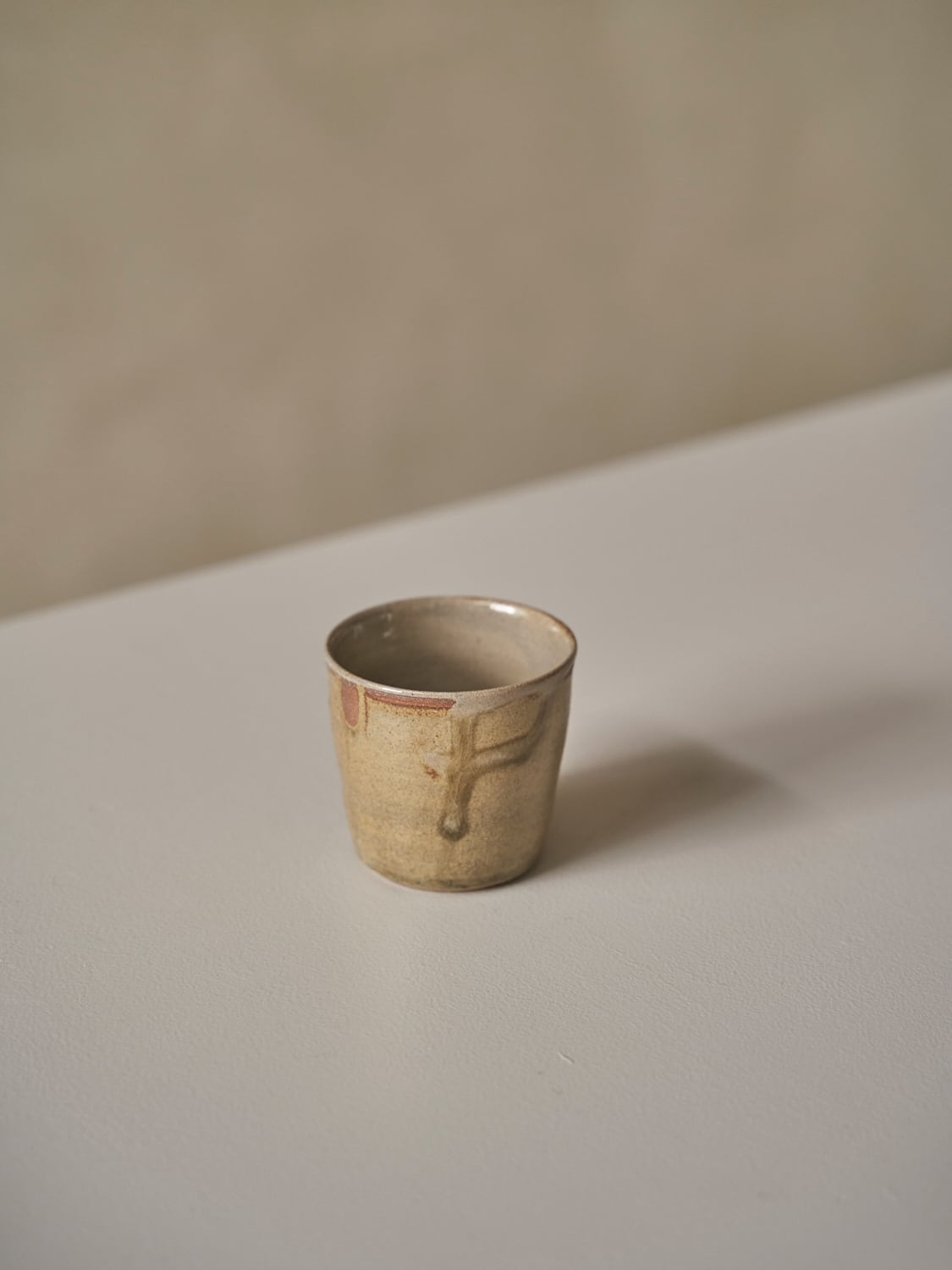 秋田菫による佐賀県唐津の土を使った陶器作品。古唐津のような素朴さをまとった佇まいのカップ。優しい形と色は「用の美」を感じさせてくれる。