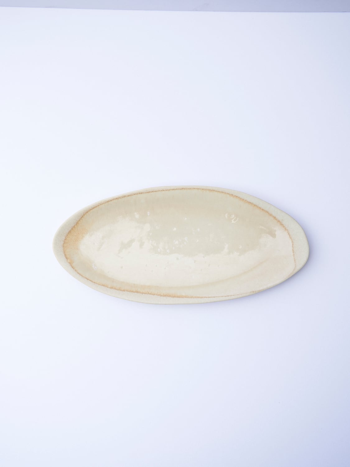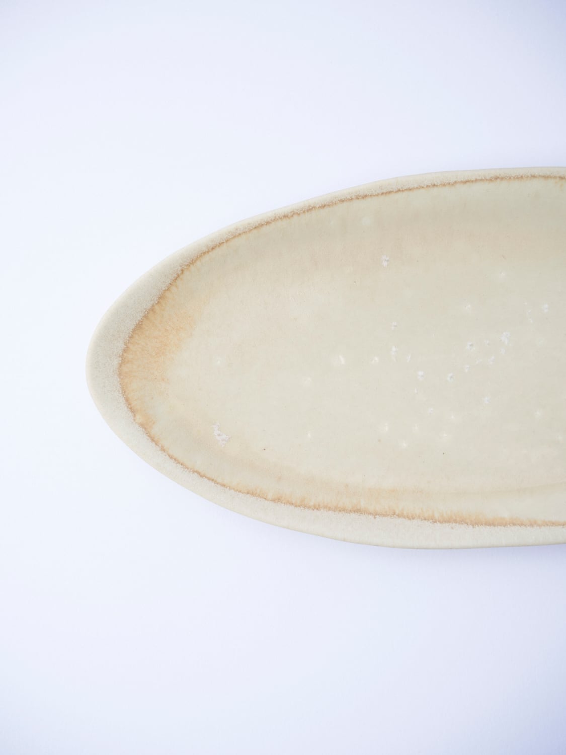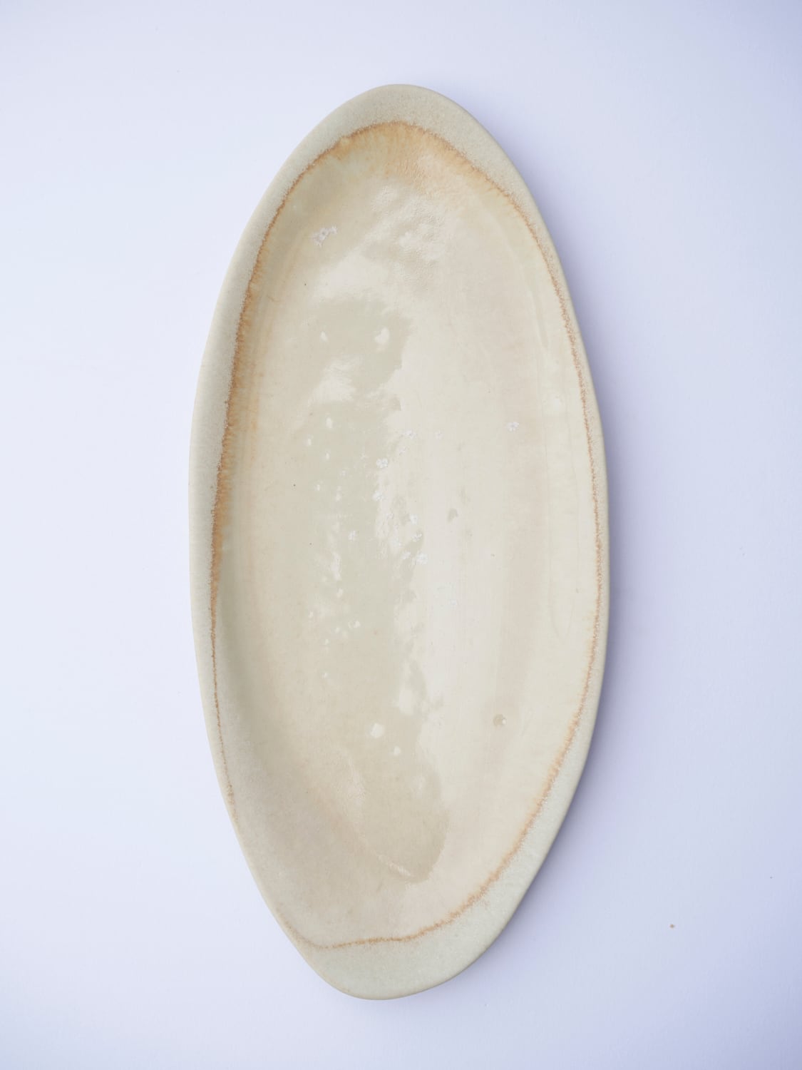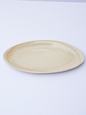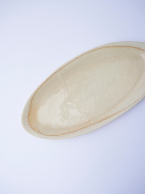 柔らかい形と色が特徴の辰巳 香(たつみ かおる)さんの作品。使っているととても穏やかな気持ちになります。オーバルのお皿は、お肉やお魚料理にとってもよく合います。リムがあるので多少の汁気のあるものも入ります。ガラス質な釉薬とマットな釉薬の境目がとても綺麗な作品です。