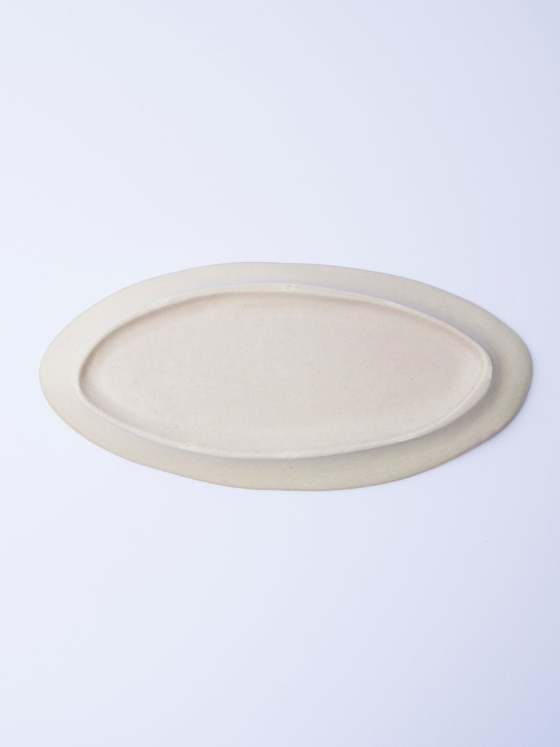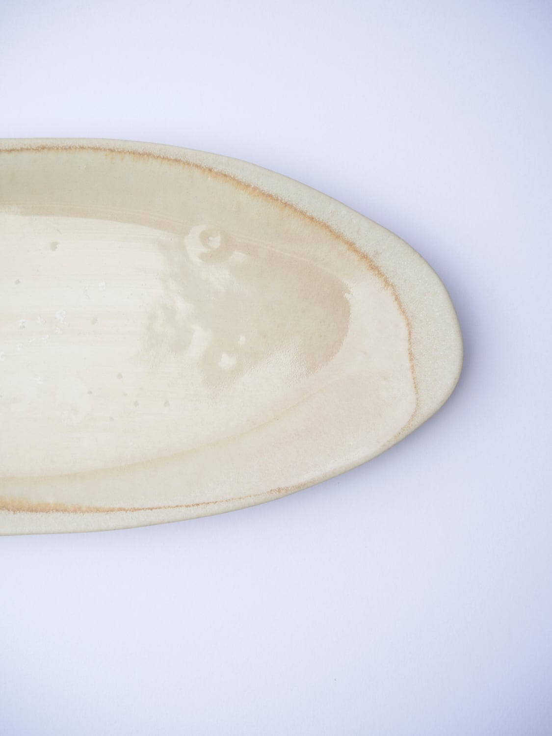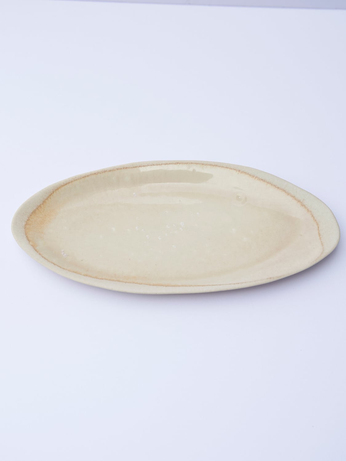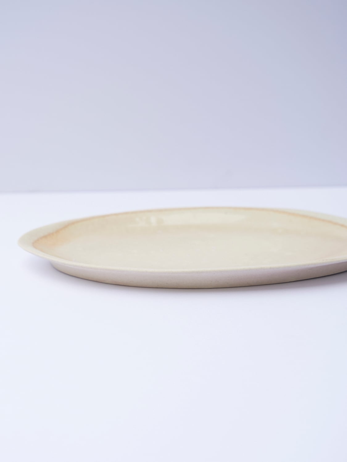 柔らかい形と色が特徴の辰巳 香(たつみ かおる)さんの作品。使っているととても穏やかな気持ちになります。オーバルのお皿は、お肉やお魚料理にとってもよく合います。リムがあるので多少の汁気のあるものも入ります。ガラス質な釉薬とマットな釉薬の境目がとても綺麗な作品です。