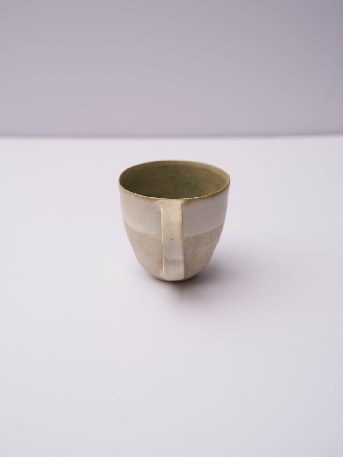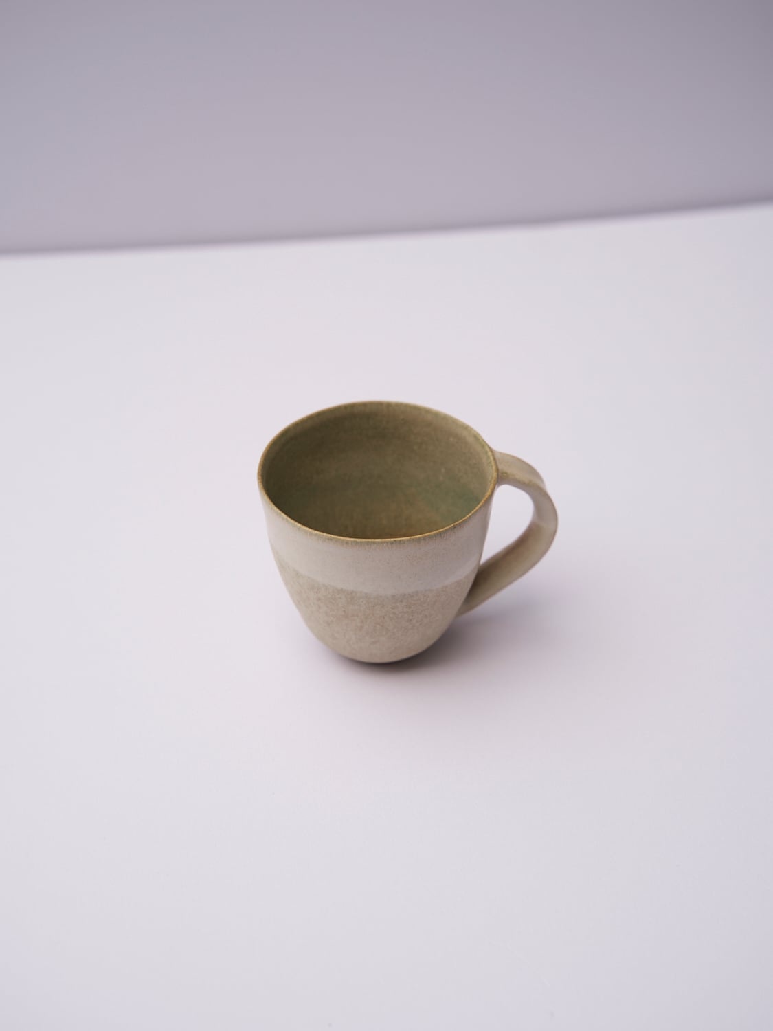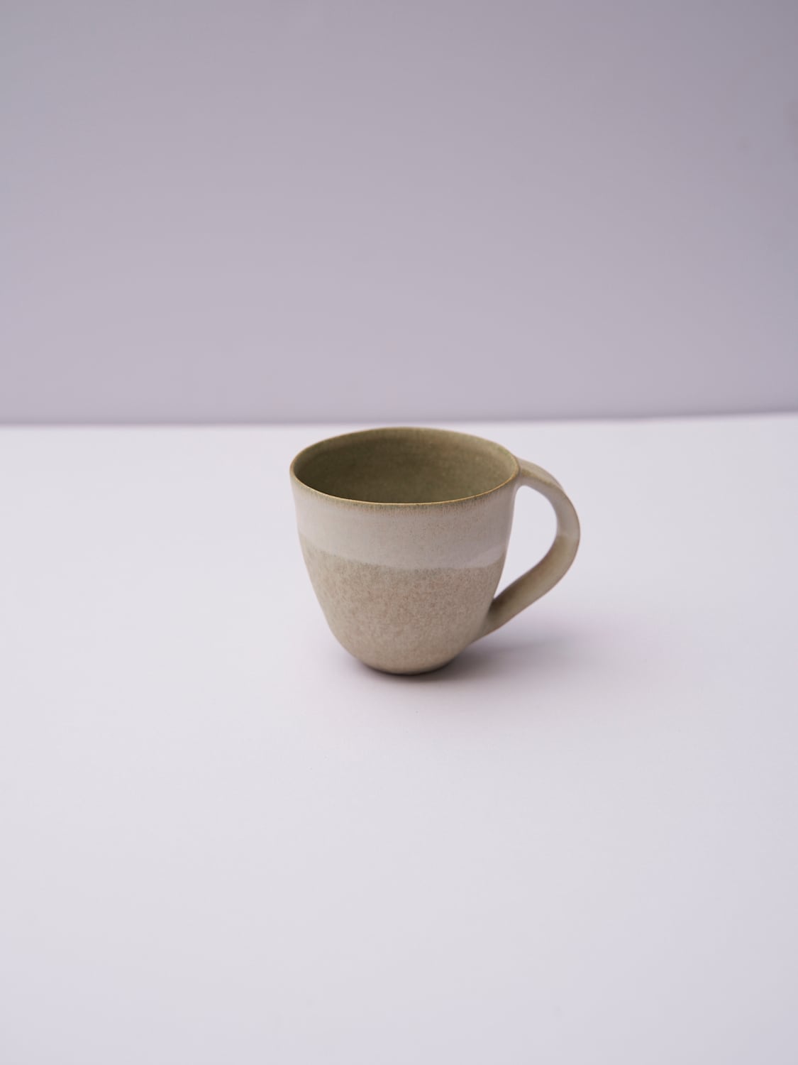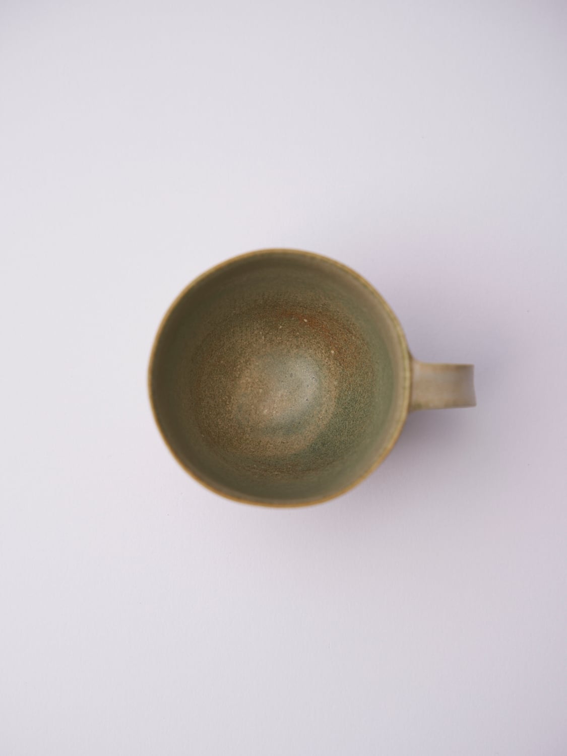柔らかい形と色が特徴の辰巳 香(たつみ かおる)さんの作品。使っているととても穏やかな気持ちになります。マグカップとしてコーヒー、紅茶、ラテやお茶などお気に入りのお飲み物に使ってください。横から見た景色が山並みのようにも見えてとても癒されます。