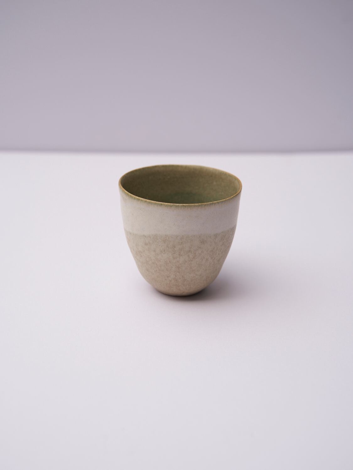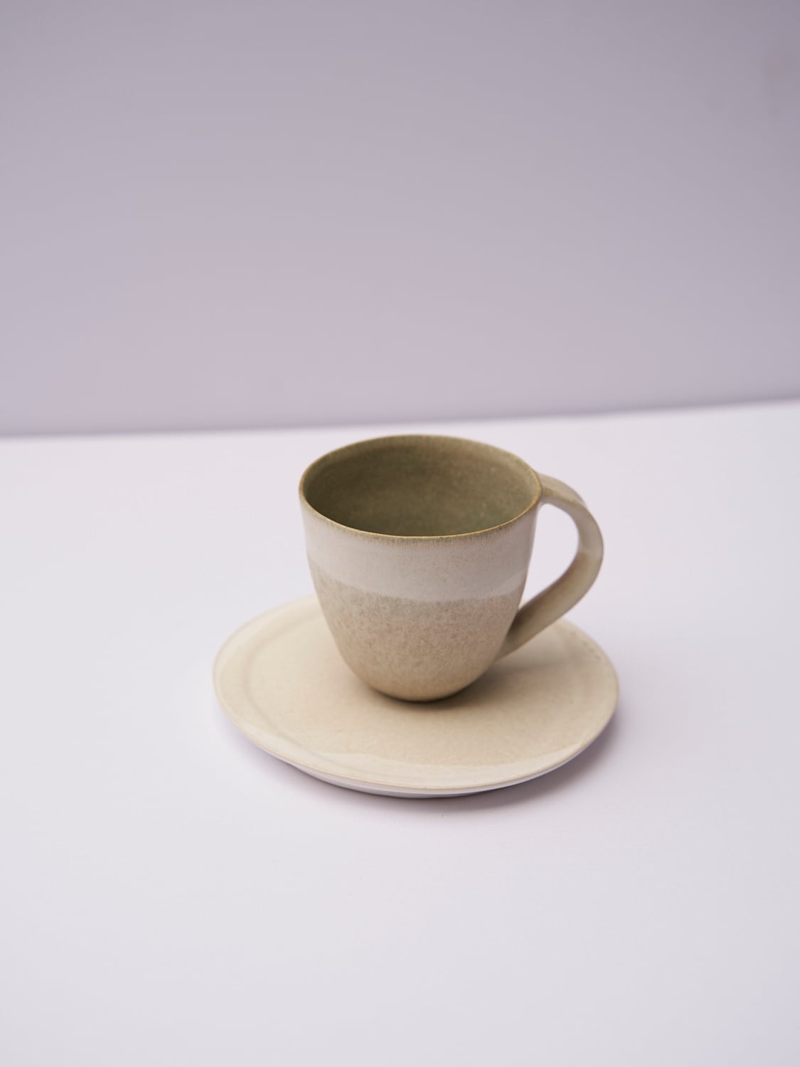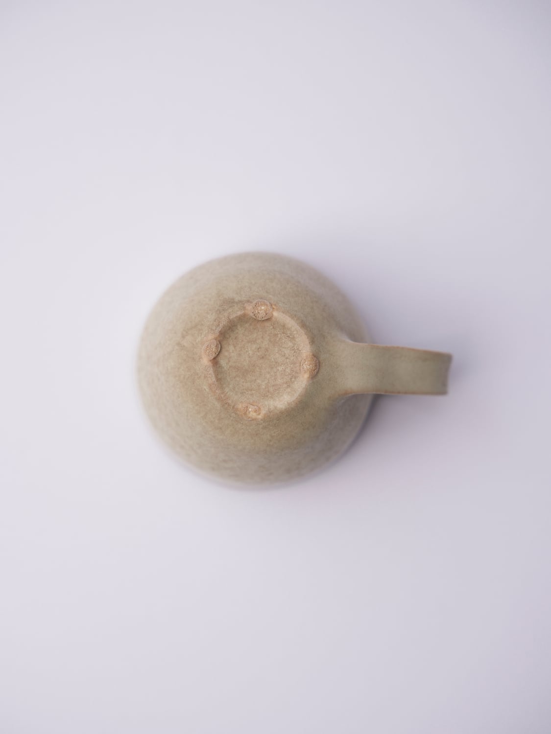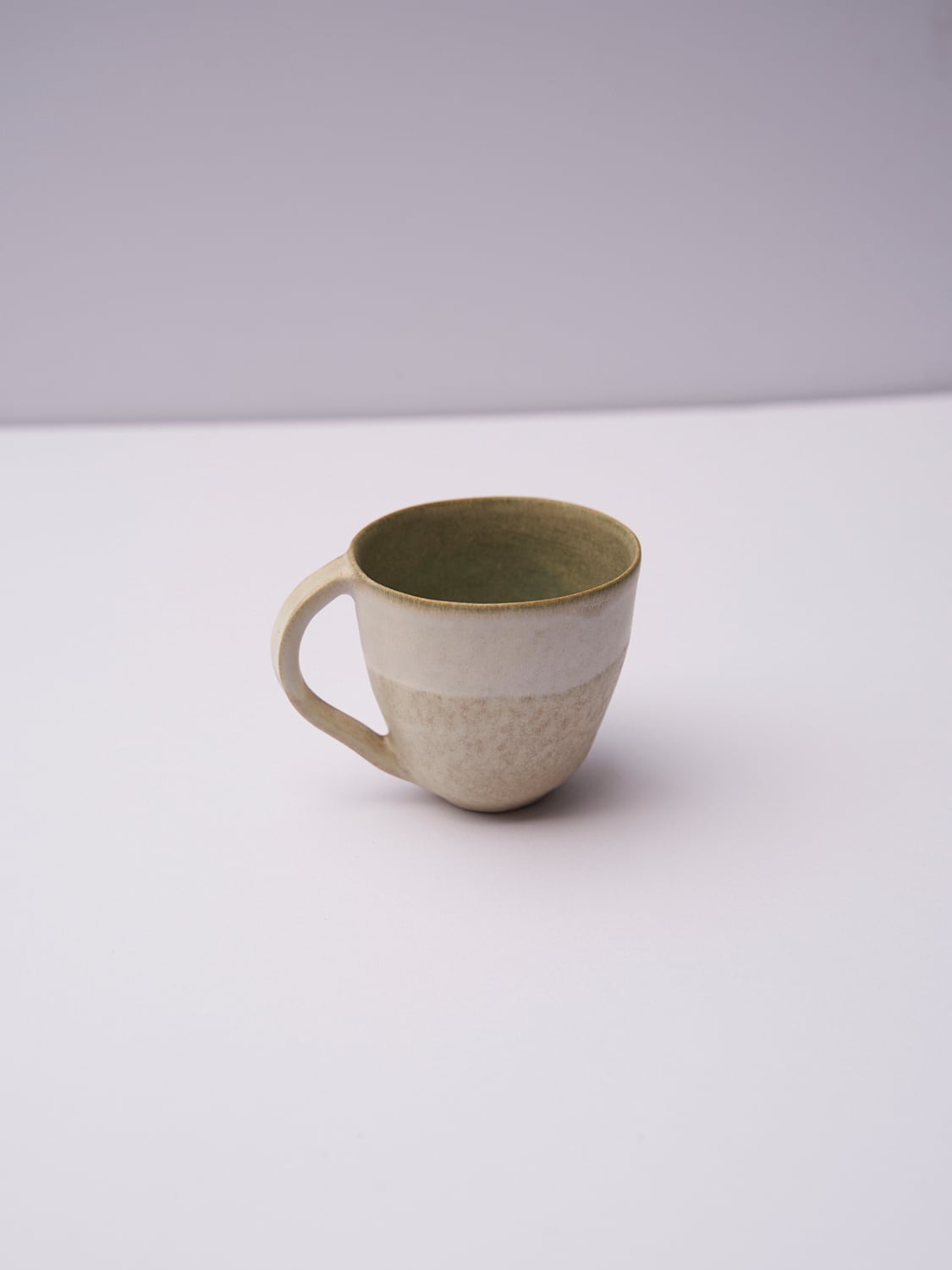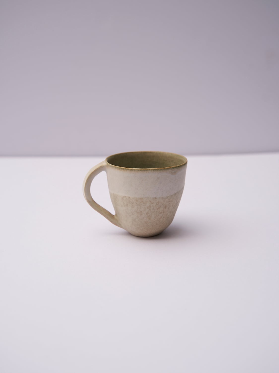 柔らかい形と色が特徴の辰巳 香(たつみ かおる)さんの作品。使っているととても穏やかな気持ちになります。マグカップとしてコーヒー、紅茶、ラテやお茶などお気に入りのお飲み物に使ってください。横から見た景色が山並みのようにも見えてとても癒されます。