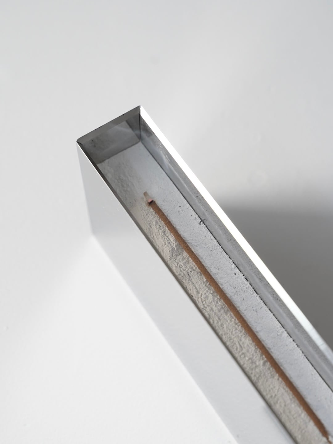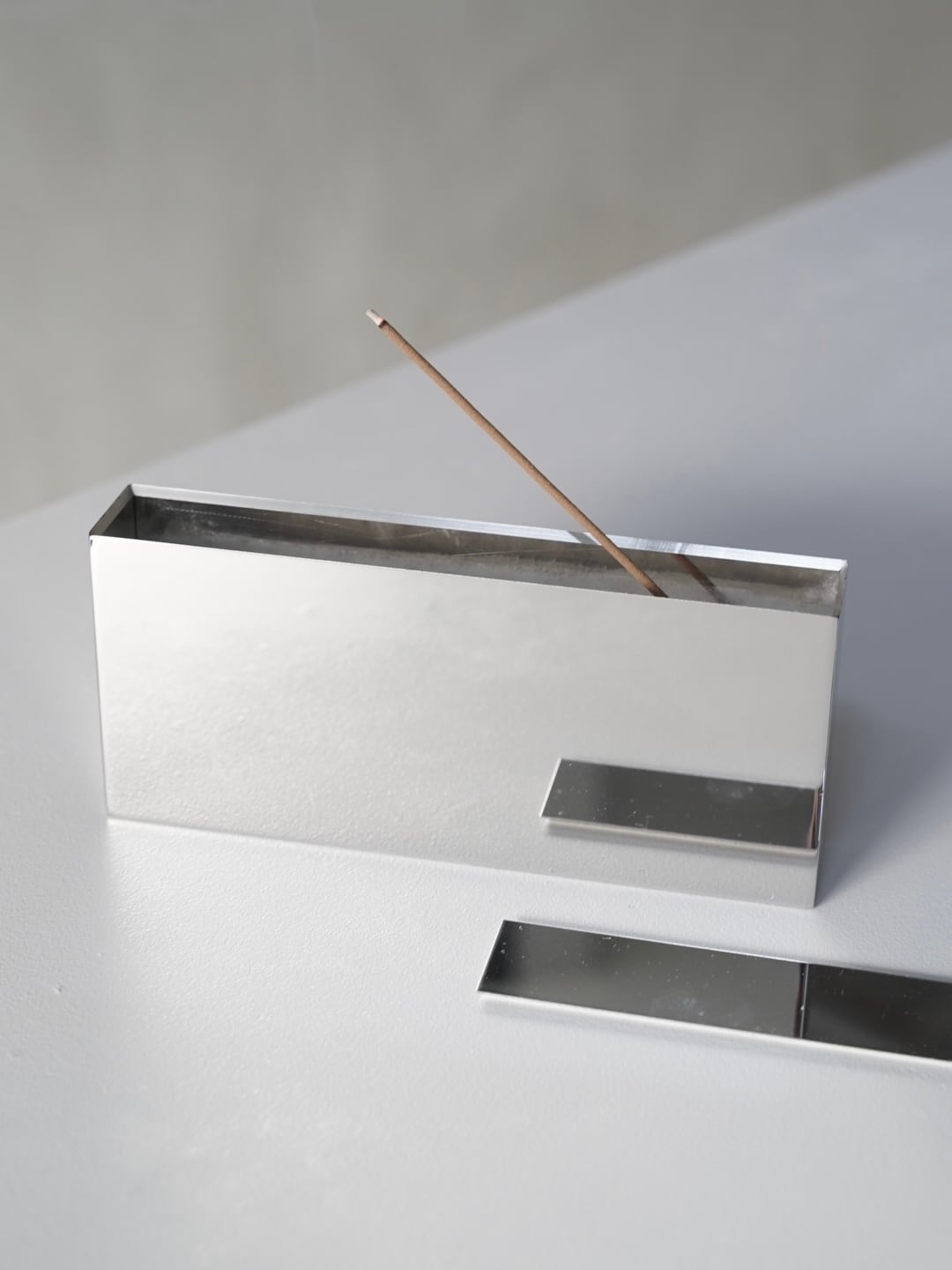 ステンレスを鏡面仕上げしたもの。形は極限までシンプルにシャープな香炉を製作いたしました。蓋をすると鏡の塊のような存在感になるようにデザインされています。一つ一つ手作業のため、多少の違いがあります。ご了承ください。